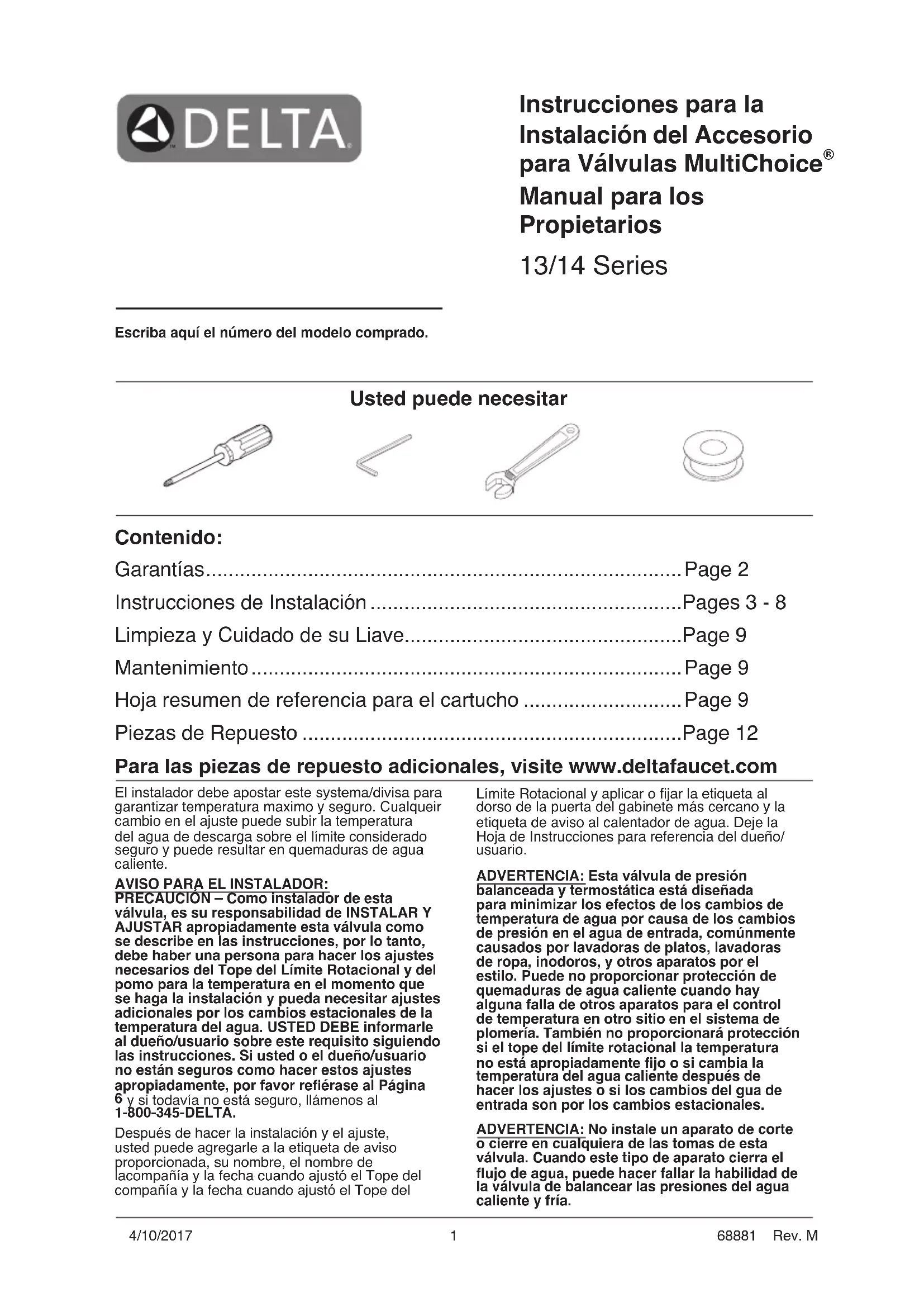 Delta Faucet Company recomienda que use los servicios de un plomero profesional para todas las instalaciones y reparaciones. Internacional le recomendamos que utilise solo las piezas de repuestos originales de Delta.