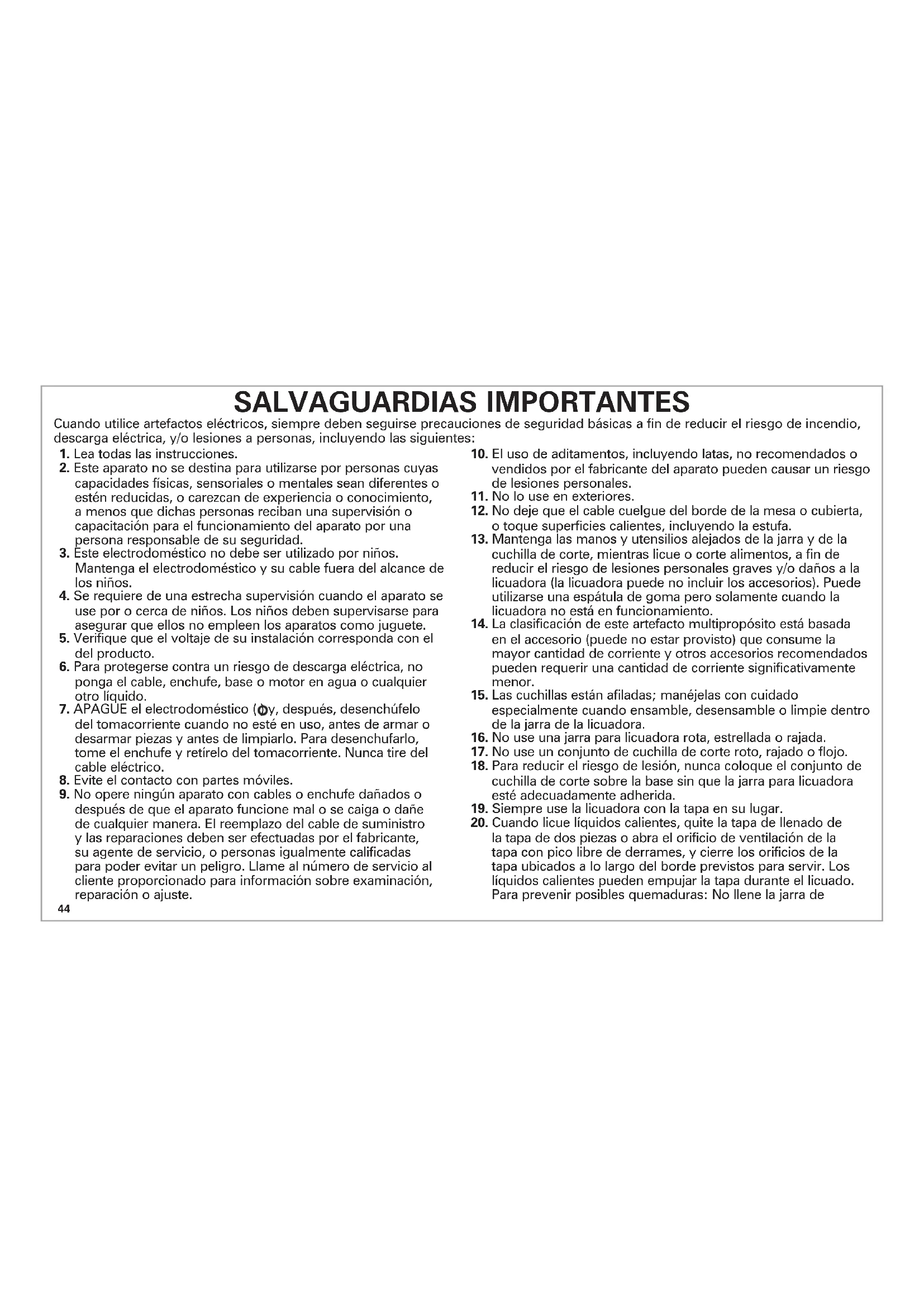 la tapa de dos piezas o abra el orificio de ventilación de la tapa con pico libre de derrames, y cierre los orificios de la tapa ubicados a lo largo del borde previstos para servir. Los líquidos calientes pueden empujar la tapa durante el licuado. Para prevenir posibles quemaduras: No llene la jarra de Cuando utilice artefactos eléctricos, siempre deben seguirse precauciones de seguridad básicas a fin de reducir el riesgo de incendio, descarga eléctrica, y/o lesiones a personas, incluyendo las siguientes:45
