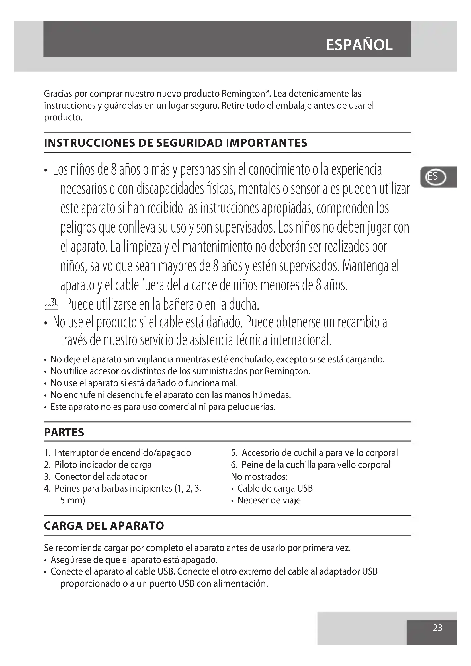 Gracias por comprar nuestro nuevo producto Remington. Lea detenidamente las instrucciones y guardelas en un lugar seguro. Retire todo el embalaje antes de usar el producto.