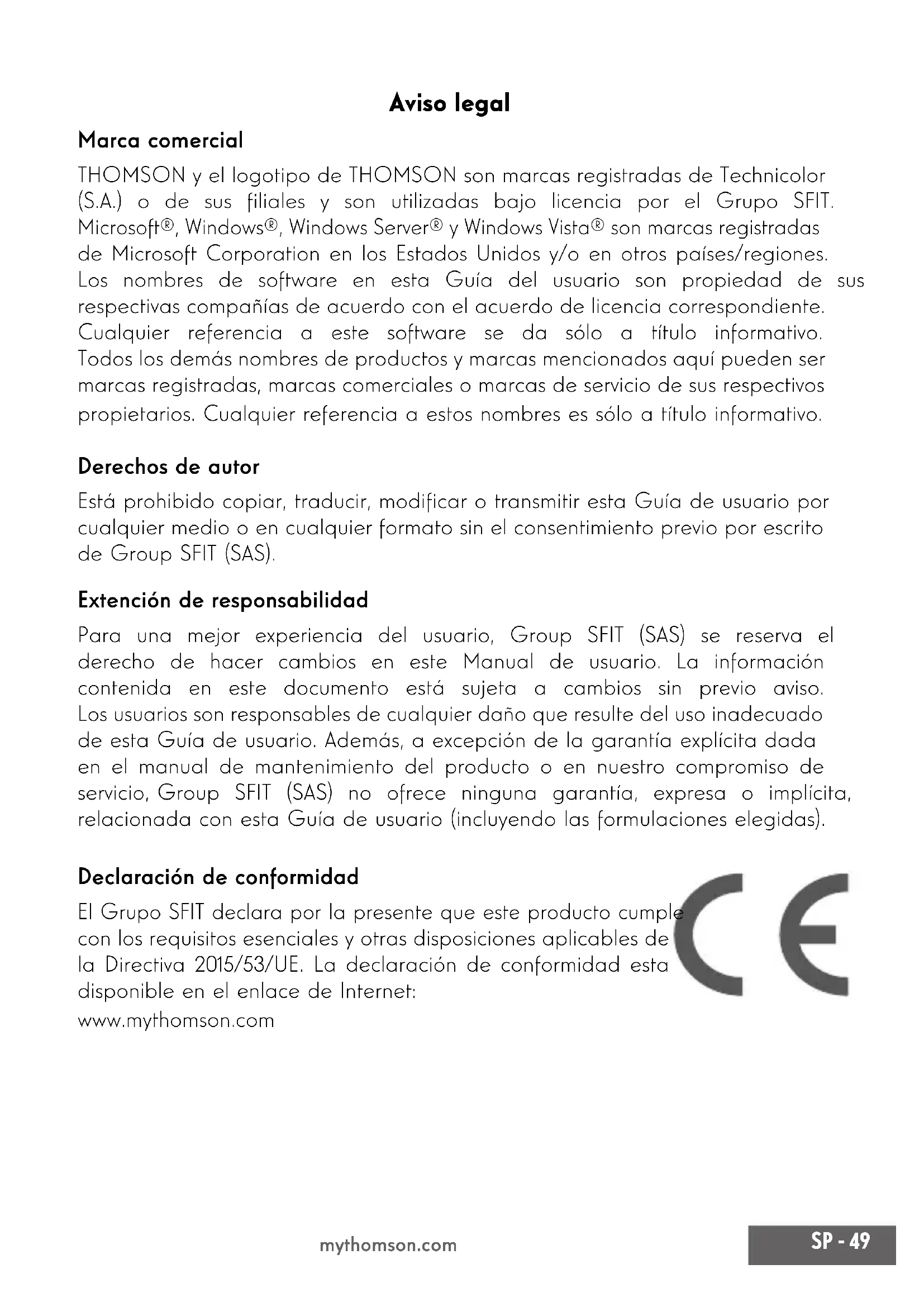mythomson.com Aviso legal Marca comercial THOMSON y el logotipo de THOMSON son marcas registradas de Technicolor (S.A.) o de sus liales y son utilizadas bajo licencia por el Grupo SFIT. Microsoft®, Windows®, Windows Server® y Windows Vista® son marcas registradas de Microsoft Corporation en los Estados Unidos y/o en otros países/regiones. Los nombres de software en esta Guía del usuario son propiedad de sus respectivas compañías de acuerdo con el acuerdo de licencia correspondiente. Cualquier referencia a este software se da sólo a título informativo. Todos los demás nombres de productos y marcas mencionados aquí pueden ser marcas registradas, marcas comerciales o marcas de servicio de sus respectivos propietarios. Cualquier referencia a estos nombres es sólo a título informativo. Derechos de autor Está prohibido copiar, traducir, modicar o transmitir esta Guía de usuario por cualquier medio o en cualquier formato sin el consentimiento previo por escrito de Group SFIT (SAS). Extención de responsabilidad Para una mejor experiencia del usuario, Group SFIT (SAS) se reserva el derecho de hacer cambios en este Manual de usuario. La información contenida en este documento está sujeta a cambios sin previo aviso. Los usuarios son responsables de cualquier daño que resulte del uso inadecuado de esta Guía de usuario. Además, a excepción de la garantía explícita dada en el manual de mantenimiento del producto o en nuestro compromiso de servicio, Group SFIT (SAS) no ofrece ninguna garantía, expresa o implícita, relacionada con esta Guía de usuario (incluyendo las formulaciones elegidas). Declaración de conformidad El Grupo SFIT declara por la presente que este producto cumple con los requisitos esenciales y otras disposiciones aplicables de la Directiva 2015/53/UE. La declaración de conformidad esta disponible en el enlace de Internet: www.mythomson.com50 - SP Manual de Usuario - NeoX - 14.1’’ i3 mythomson.com - Instrucciones importantes de seguridad - Esta unidad debe usarse en un ambiente con una temperatura ambiente entre 5°C (41°F) y 35°C (95°F). No exponga la unidad a la lluvia o la humedad y manténgala alejada de los líquidos. En caso de salpicaduras de agua u otro líquido sobre la unidad, apáguela inmediatamente y espere a que esté completamente seca antes de volver a encenderla. No exponga el aparato directamente a la radiación solar. No utilice disolventes fuertes, detergentes líquidos u otros productos químicos sobre o cerca de la supercie de la unidad para evitar la corrosión o el deterioro de la supercie de la unidad. No exponga la cámara a un entorno polvoriento. No utilice la unidad durante una fuga de gas. No exponga el dispositivo a campos magnéticos o eléctricos fuertes. Puede pasar el dispositivo por los detectores de rayos X del aeropuerto. Sin embargo, se recomienda no pasar el dispositivo por los portales de detección magnética ni exponerlo a detectores portátiles. No coloque ningún objeto sobre el dispositivo. No coloque la unidad sobre una supercie irregular o inestable. Asegúrese de proteger la unidad contra caídas o cualquier otro impacto que pueda dañarla. No deje el aparato puesto o cargado en su regazo o en cualquier otra parte de su cuerpo para evitar cualquier riesgo de lesiones relacionadas con el calor. Apague la unidad antes de transportarla o de cubrirla con un material que no permita una circulación óptima de aire. No utilice cables de alimentación, accesorios u otros dispositivos dañados con su dispositivo. Recomendamos el uso exclusivo de los accesorios (fuente de alimentación, cables, etc.) suministrados con la unidad.SP - 51 mythomson.com Utilice únicamente baterías originales. La sustitución de la batería por una batería incorrecta puede causar un riesgo de explosión. No desmonte, modique o repare la unidad usted mismo, ya que esto puede anular la garantía. Por favor, haga copias de seguridad de su contenido importante con regularidad para evitar la pérdida de datos. Nuestra empresa no se hace responsable de la pérdida o eliminación de los elementos contenidos en el dispositivo debido al uso inadecuado del hardware o software, a la falta de mantenimiento o a cualquier otro evento accidental. A plena potencia, prolongada escuchar el reproductor de música puede dañar el oído del usuario. Este producto ha sido diseñado para permitir el reciclaje adecuado de piezas y componentes. El símbolo que representa un contenedor de basura tachado indica que el dispositivo no debe desecharse con residuos municipales. Consulte la normativa local para la eliminación de aparatos electrónicos. El símbolo que representa un contenedor de basura tachado indica que la batería no debe desecharse con los residuos municipales. Consulte las regulaciones locales para la eliminación de baterías.52 - SP Manual de Usuario - NeoX - 14.1’’ i3 mythomson.com - Presentación del dispositivo - Vista frontal Nota : La presentación del dispositivo y algunas características pueden variar según el país, modelo o versión. Vista izquierda Vista derecha