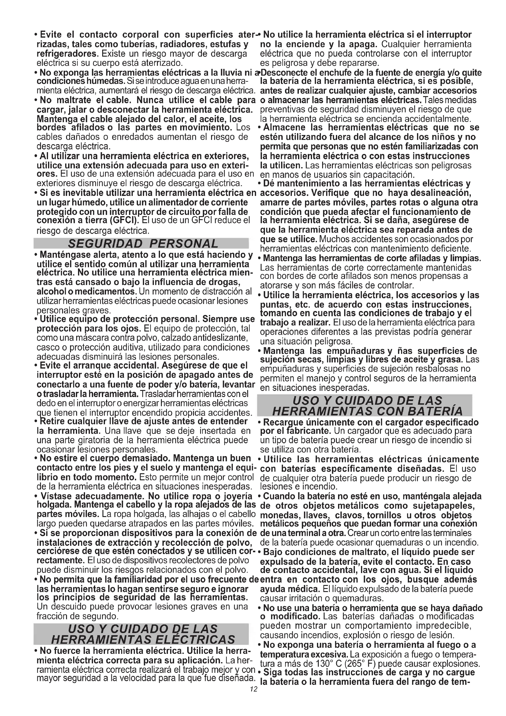 - Si es inevitable utilizar una herramienta eléctrica en un lugar húmedo, utilice un alimentador de corriente protegido con un interruptor de circuito por falla de conexión a tierra (GFCI). El uso de un GFCI reduce el riesgo de descarga eléctrica. SEGURIDAD PERSONAL