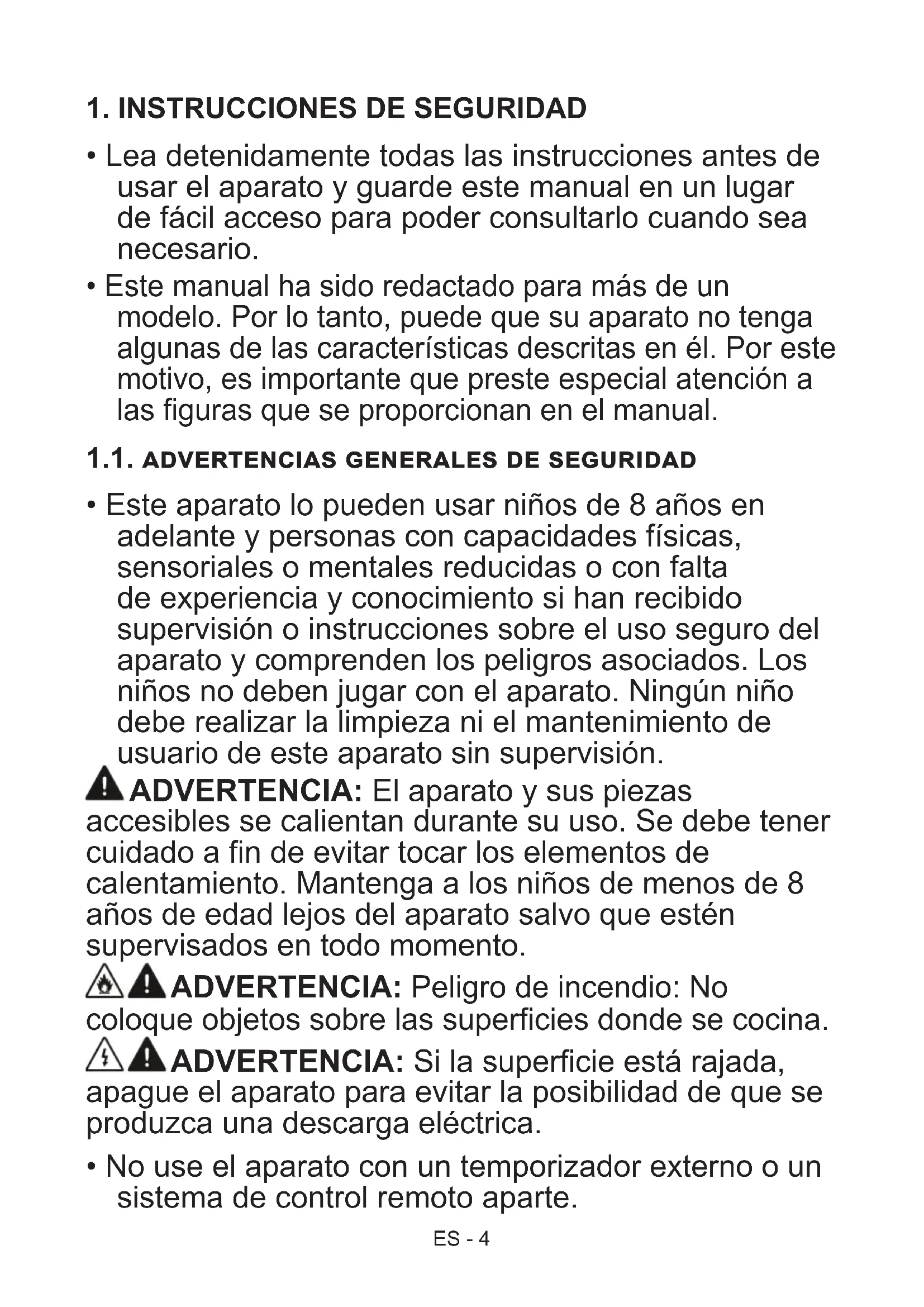 - Este aparato lo pueden usar niños de 8 años en adelante y personas con capacidades físicas, sensoriales o mentales reducidas o con falta de experiencia y conocimiento si han recibido supervisión o instrucciones sobre el uso seguro del aparato y comprenden los peligros asociados. Los niños no deben jugar con el aparato. Ningún niño debe realizar la limpieza ni el mantenimiento de usuario de este aparato sin supervisión. ADVERTENCIA: El aparato y sus piezas accesibles se calientan durante su uso. Se debe tener cuidado a fin de evitar tocar los elementos de calentamiento. Mantenga a los niños de menos de 8 años de edad lejos del aparato salvo que estén supervisados en todo momento. ADVERTENCIA: Peligro de incendio: No coloque objetos sobre las superficies donde se cocina. ADVERTENCIA: Si la superficie está rajada, apague el aparato para evitar la posibilidad de que se produzca una descarga eléctrica.