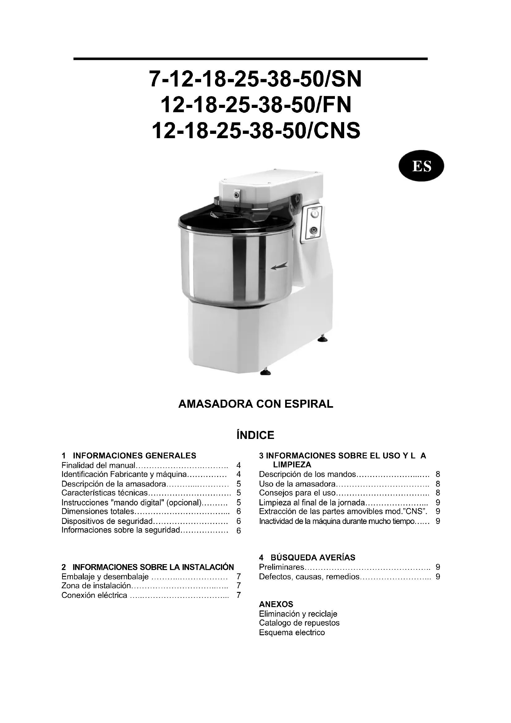 Se puede desmontar la cubeta, lo cual permite el lavado de esta pieza con agua corriente caliente o bien en el lavavajillas. Características técnicas Descripciones Unidad de medida 7/SN 12/SN 18/SN 25/SN 38/SN 50/SNAlimentación de energía eléctrica V Hz Ph 230V 50Hz 1Ph 230/400V 50Hz 3Ph 230/400V 50Hz 3Ph Potencia kW (HP) 0.37(0.5) 0.75 (1) 0.75 (1) 1.5 (2) 1.5 (2) 2.2 (3) Amasado para cada ciclo kg 7 12 18 25 38 50 Peso neto kg 39 58 59 93 105 175 Peso con embalaje kg 46 65 66 100 112 195 Descripciones Unidad de medida 12/CNS-FN 18/CNS-FN 25/CNS-FN 38/CNS-FN 50/CNS-FN Alimentación de energía eléctrica V Hz Ph 230V 50Hz 1Ph 230/400V 50Hz 3Ph 230/400V 50Hz 3Ph Potencia kW (HP) 0.75 (1) 0.75 (1) 1.5 (2) 1.5 (2) 2.2 (3) Amasado para cada ciclo kg 12 18 25 38 50 Peso neto kg 65 66 103 115 206 Peso con embalaje kg 72 73 112 127 230 Nivel de ruido < 70 dB(A) Instalación En el piso Instrucciones "mando digital" (opcional) Asegúrese de que la clavija de alimentación esté correctamente conectada a la toma corriente y presione la tecla “START/STOP”; la máquina se encenderá y estará lista para el uso (se iluminará el led al costado de la tecla). Para iniciar la máquina en modalidad "temporizador", presione 2 veces seguidas la tecla con el símbolo del reloj (se iluminará el led que se encuentra al lado) y configure el tiempo deseado para amasar mediante las teclas +/-. Luego de haber configurado el tiempo deseado para amasar (visualizado en el visor), y una vez confirmado que la tapa de la olla está baja, presione la tecla “START/STOP”, para poner en movimiento la máquina; en el visor se leerá la cuenta regresiva del tiempo configurado anteriormente. En caso de que se desee detener la máquina para agregar ingredientes o por cualquier otro motivo, antes de levantar la tapa de la olla, ponga la máquina en pausa presionando nuevamente la tecla “START/STOP”, de este modo se detendrá también el temporizador, y volverá a arrancar junto con la máquina solo bajando primero la tapa y luego presionando nuevamente la tecla “START/STOP”. Antes de levantar la tapa de la olla ponga en pausa la máquina, de lo contrario el temporizador continuará su cuenta regresiva, incluso si la máquina está parada. Una vez completado el tiempo, la máquina se detendrá. Si se desea trabajar sin temporizador, presione 2 veces consecutivas la tecla con el símbolo de la "mano" (manual), se iluminará el led de al lado (excluye el temporizador), y, presionando la tecla “START/STOP”, arrancará la máquina en modalidad manual. Una vez terminado el ciclo si se presiona la tecla “START/STOP”, la máquina se detiene. Para apagar completamente el visor mantenga presionada la tecla “START/STOP” durante 3 segundos aproximadamente. 5INFORMACIONES GENERALES