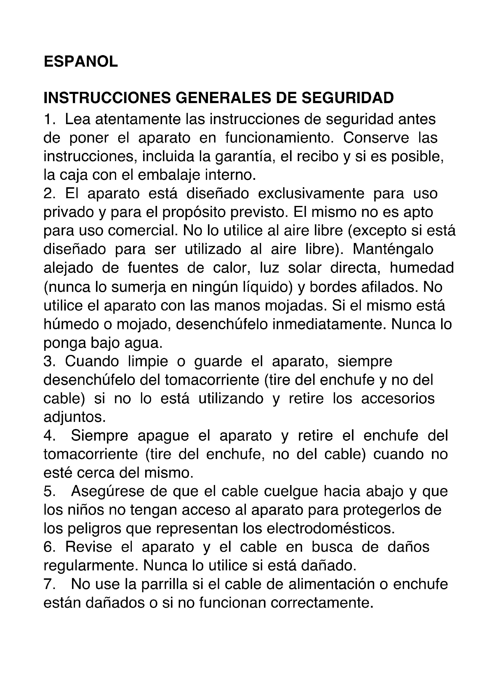 7. No use la parrilla si el cable de alimentacion o enchufe está danados o si no funciona correctamente.