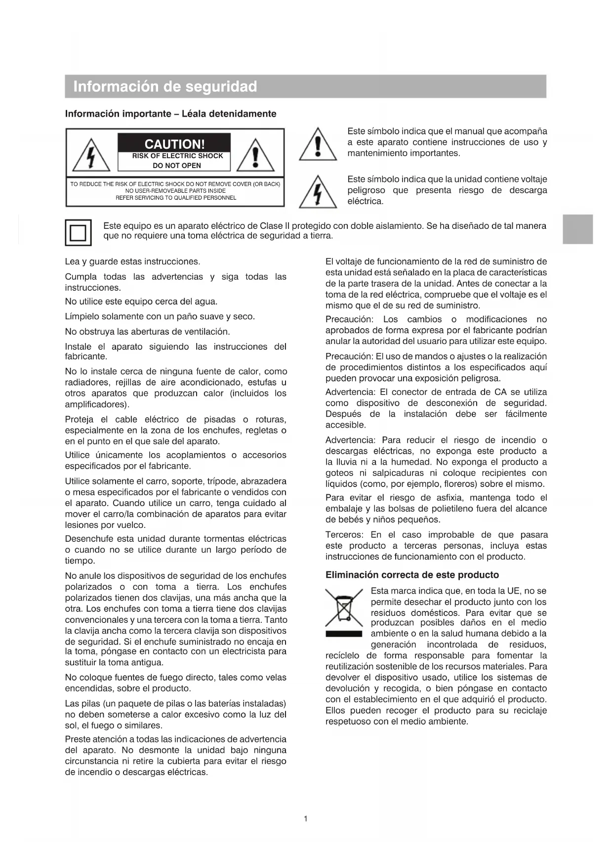 Información de seguridad Información importante – Léala detenidamente CAUTION! RISK OF ELECTRIC SHOCKDO NOT OPENTO REDUCE THE RISK OF ELECTRIC SHOCK DO NOT REMOVE COVER (OR BACK)NO USER-REMOVEABLE PARTS INSIDEREFER SERVICING TO QUALIFIED PERSONNEL Este símbolo indica que el manual que acompaña a este aparato contiene instrucciones de uso y mantenimiento importantes. Este símbolo indica que la unidad contiene voltaje peligroso que presenta riesgo de descarga eléctrica. Lea y guarde estas instrucciones. Cumpla todas las advertencias y siga todas las instrucciones. No utilice este equipo cerca del agua. Límpielo solamente con un paño suave y seco. No obstruya las aberturas de ventilación. Instale el aparato siguiendo las instrucciones del fabricante. No lo instale cerca de ninguna fuente de calor, como radiadores, rejillas de aire acondicionado, estufas u otros aparatos que produzcan calor (incluidos los amplificadores). Proteja el cable eléctrico de pisadas o roturas, especialmente en la zona de los enchufes, regletas o en el punto en el que sale del aparato. Utilice únicamente los acoplamientos o accesorios especificados por el fabricante. Utilice solamente el carro, soporte, trípode, abrazadera o mesa especificados por el fabricante o vendidos con el aparato. Cuando utilice un carro, tenga cuidado al mover el carro/la combinación de aparatos para evitar lesiones por vuelco. Desenchufe esta unidad durante tormentas eléctricas o cuando no se utilice durante un largo período de tiempo. No anule los dispositivos de seguridad de los enchufes polarizados o con toma a tierra. Los enchufes polarizados tienen dos clavijas, una más ancha que la otra. Los enchufes con toma a tierra tiene dos clavijas convencionales y una tercera con la toma a tierra. Tanto la clavija ancha como la tercera clavija son dispositivos de seguridad. Si el enchufe suministrado no encaja en la toma, póngase en contacto con un electricista para sustituir la toma antigua. No coloque fuentes de fuego directo, tales como velas encendidas, sobre el producto. Las pilas (un paquete de pilas o las baterías instaladas) no deben someterse a calor excesivo como la luz del sol, el fuego o similares. Preste atención a todas las indicaciones de advertencia del aparato. No desmonte la unidad bajo ninguna circunstancia ni retire la cubierta para evitar el riesgo de incendio o descargas eléctricas. El voltaje de funcionamiento de la red de suministro de esta unidad está señalado en la placa de características de la parte trasera de la unidad. Antes de conectar a la toma de la red eléctrica, compruebe que el voltaje es el mismo que el de su red de suministro. Precaución: Los cambios o modificaciones no aprobados de forma expresa por el fabricante podrían anular la autoridad del usuario para utilizar este equipo. Precaución: El uso de mandos o ajustes o la realización de procedimientos distintos a los especificados aquí pueden provocar una exposición peligrosa. Advertencia: El conector de entrada de CA se utiliza como dispositivo de desconexión de seguridad. Después de la instalación debe ser fácilmente accesible. Advertencia: Para reducir el riesgo de incendio o descargas eléctricas, no exponga este producto a la lluvia ni a la humedad. No exponga el producto a goteos ni salpicaduras ni coloque recipientes con líquidos (como, por ejemplo, floreros) sobre el mismo. Para evitar el riesgo de asfixia, mantenga todo el embalaje y las bolsas de polietileno fuera del alcance de bebés y niños pequeños. Terceros: En el caso improbable de que pasara este producto a terceras personas, incluya estas instrucciones de funcionamiento con el producto. Eliminación correcta de este producto Esta marca indica que, en toda la UE, no se permite desechar el producto junto con los residuos domésticos. Para evitar que se produzcan posibles daños en el medio ambiente o en la salud humana debido a la generación incontrolada de residuos, recíclelo de forma responsable para fomentar la reutilización sostenible de los recursos materiales. Para devolver el dispositivo usado, utilice los sistemas de devolución y recogida, o bien póngase en contacto con el establecimiento en el que adquirió el producto. Ellos pueden recoger el producto para su reciclaje respetuoso con el medio ambiente. Este equipo es un aparato eléctrico de Clase II protegido con doble aislamiento. Se ha diseñado de tal manera que no requiere una toma eléctrica de seguridad a tierra.2
