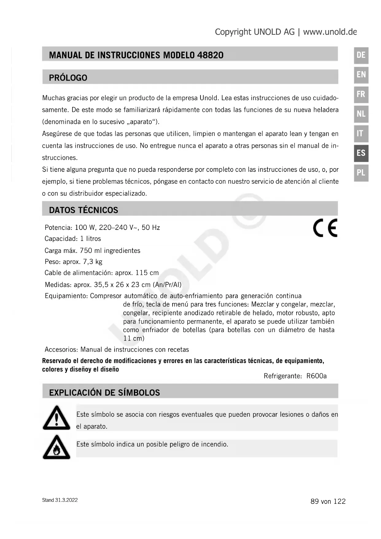 Este símbolo se asocia con riesgos eventuales que pueden provocar lesiones o daños en el aparato. Este símbolo indica un posible peligro de incendio. Muchas gracias por elegir un producto de la empresa Unold. Lea estas instrucciones de uso cuidado- samente. De este modo se familiarizará rápidamente con todas las funciones de su nueva heladera (denominada en lo sucesivo „aparato“). Asegúrese de que todas las personas que utilicen, limpien o mantengan el aparato lean y tengan en cuenta las instrucciones de uso. No entregue nunca el aparato a otras personas sin el manual de in- strucciones. Si tiene alguna pregunta que no pueda responderse por completo con las instrucciones de uso, o, por ejemplo, si tiene problemas técnicos, póngase en contacto con nuestro servicio de atención al cliente o con su distribuidor especializado. PRÓLOGO Refrigerante: R600a Copyright UNOLD AG | www.unold.de UNOLD ©90 von 122 Stand 31.3.2022