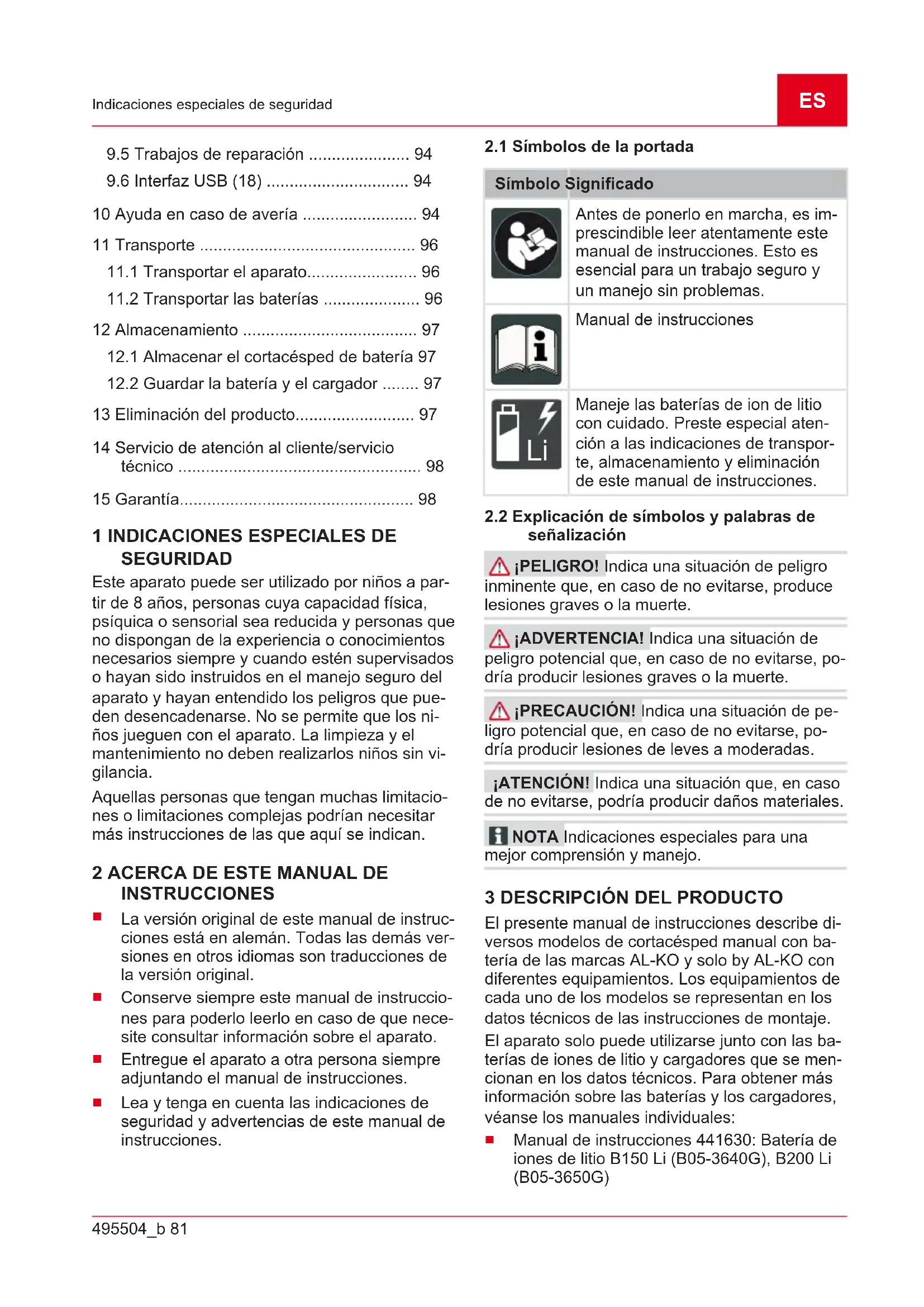El presente manual de instrucciones describe di- versos modelos de cortacésped manual con ba- tería de las marcas AL‑KO y solobyAL‑KO con diferentes equipamientos. Los equipamientos de cada uno de los modelos se representan en los datos técnicos de las instrucciones de montaje. El aparato solo puede utilizarse junto con las ba- terías de iones de litio y cargadores que se men- cionan en los datos técnicos. Para obtener más información sobre las baterías y los cargadores, véanse los manuales individuales: