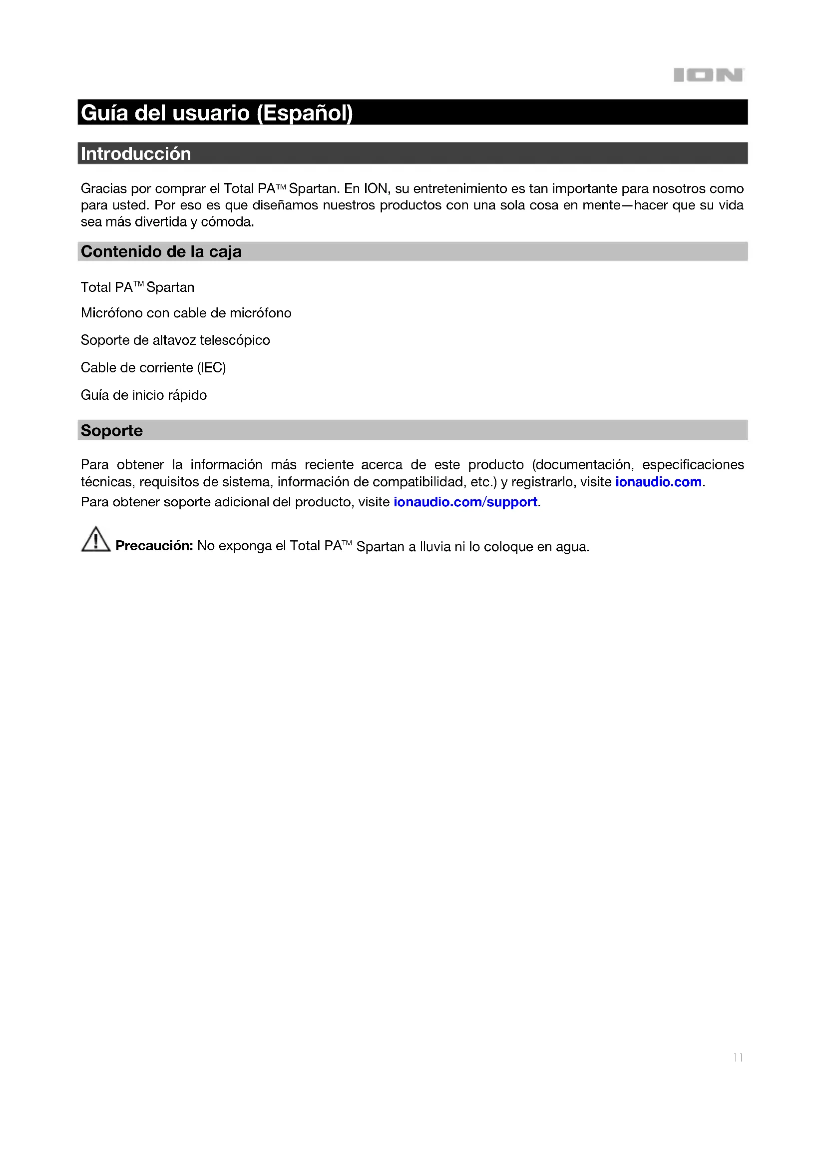 Spartan. En ION, su entretenimiento es tan importante para nosotros como para usted. Por eso es que diseñamos nuestros productos con una sola cosa en mente—hacer que su vida sea más divertida y cómoda. Contenido de la caja Total PA
