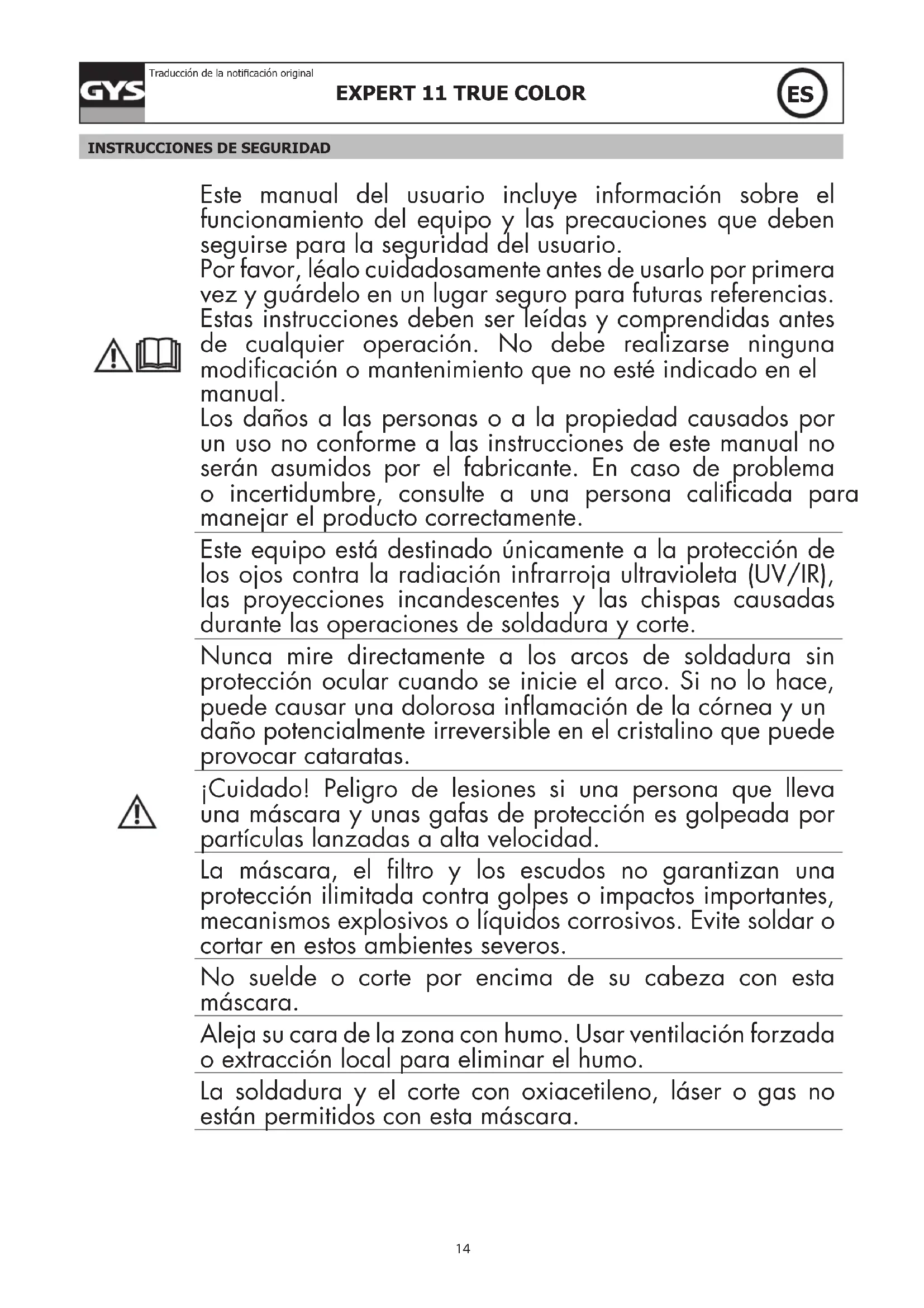 Este manual del usuario incluye información sobre el funcionamiento del equipo y las precauciones que deben seguirse para la seguridad del usuario. Por favor, léalo cuidadosamente antes de usarlo por primera vez y guárdelo en un lugar seguro para futuras referencias. Estas instrucciones deben ser leídas y comprendidas antes de cualquier operación. No debe realizarse ninguna modicación o mantenimiento que no esté indicado en el manual. Los daños a las personas o a la propiedad causados por un uso no conforme a las instrucciones de este manual no serán asumidos por el fabricante. En caso de problema o incertidumbre, consulte a una persona calicada para manejar el producto correctamente. Este equipo está destinado únicamente a la protección de los ojos contra la radiación infrarroja ultravioleta (UV/IR), las proyecciones incandescentes y las chispas causadas durante las operaciones de soldadura y corte. Nunca mire directamente a los arcos de soldadura sin protección ocular cuando se inicie el arco. Si no lo hace, puede causar una dolorosa inamación de la córnea y un daño potencialmente irreversible en el cristalino que puede provocar cataratas. ¡Cuidado! Peligro de lesiones si una persona que lleva una máscara y unas gafas de protección es golpeada por partículas lanzadas a alta velocidad. La máscara, el ltro y los escudos no garantizan una protección ilimitada contra golpes o impactos importantes, mecanismos explosivos o líquidos corrosivos. Evite soldar o cortar en estos ambientes severos. No suelde o corte por encima de su cabeza con esta máscara. Aleja su cara de la zona con humo. Usar ventilación forzada o extracción local para eliminar el humo. La soldadura y el corte con oxiacetileno, láser o gas no están permitidos con esta máscara.15