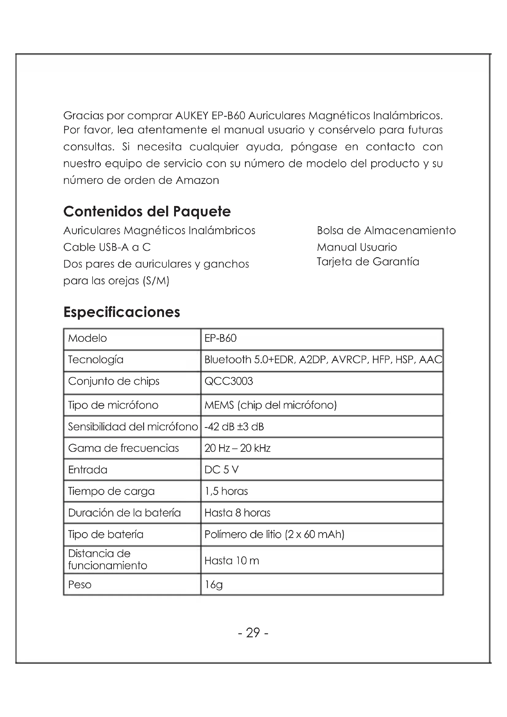 Preguntas frecuentes Los auriculares están encendidos pero no se conectan a mi dispositivo Para que los auriculares y su dispositivo se conecten, debe poner ambos en el modo de emparejamiento. Por favor, siga las instrucciones indicadas en la sección «Emparejamiento» de este manual. He establecido una conexión con mi smartphone pero no oigo ningún sonido Revise el nivel de volumen tanto en su smartphone como en los auriculares. Algunos smartphones le solicitarán que configure los auriculares como un dispositivo de salida de audio antes de transmitir sonidos. Si utiliza un reproductor de música u otro dispositivo, asegúrese de que es compatible con el perfil de música estéreo A2DP. El sonido no está muy claro o la persona que me llama no me oye con claridad Ajuste el volumen de su smartphone y de los auriculares. Pruebe a acercarse a su smartphone para descartar la posibilidad de que se trate de un problema relacionado con posibles interferencias o con la distancia. ¿Cuál es la distancia de funcionamiento inalámbrico de los auriculares? La distancia máxima es de 10 m. Sin embargo, la distancia puede variar en función de factores ambientales. Para lograr el mejor rendimiento, guarde una distancia de 5 a 10 m entre los auriculares y el dispositivo y asegúrese de que no hay obstáculos significativos (como muros reforzados de acero) entre ellos. Mis auriculares no se encienden Pruebe a cargarlos durante un rato. Si siguen sin encenderse, póngasePRECAUCIÓN: SI LA BATERÍA SE SUSTITUYE POR UN TIPO INCORRECTO, EXISTE RIESGO DE EXPLOSIÓN. DESECHE LAS BATERÍAS USADAS SIGUIENDO LAS INSTRUCCIONES. Una presión sonora excesiva de los auriculares puede producir pérdida auditiva. Por la presente, Shenzhen AUKEY E Business Co., Ltd. Declara que el tipo de equipamiento de radio (auriculares Bluetooth