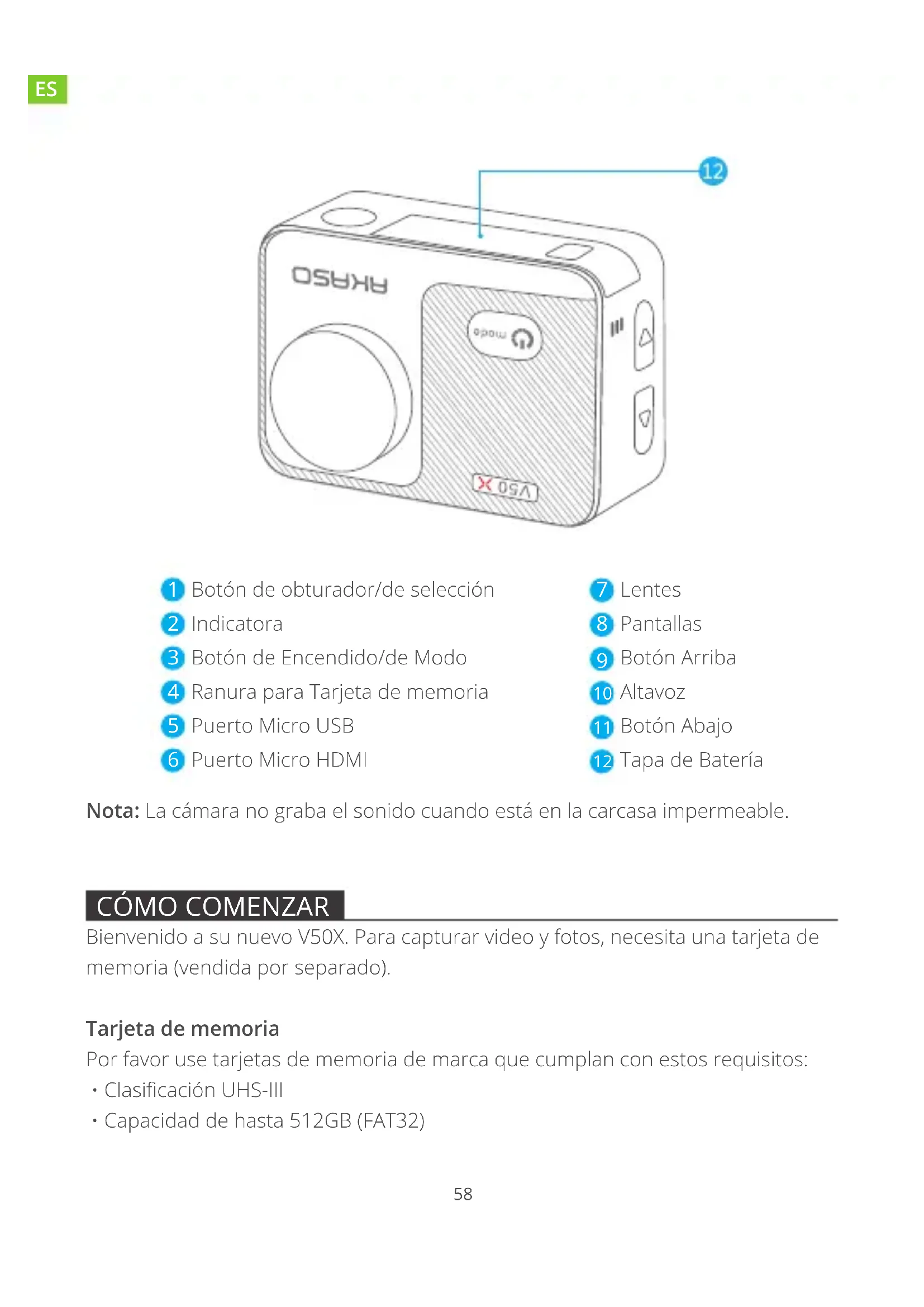 Bienvenido a su nuevo V50X. Para capturar video y fotos, necesita una tarjeta de memoria (vendida por separado). Tarjeta de memoria Por favor use tarjetas de memoria de marca que cumplan con estos requisitos: