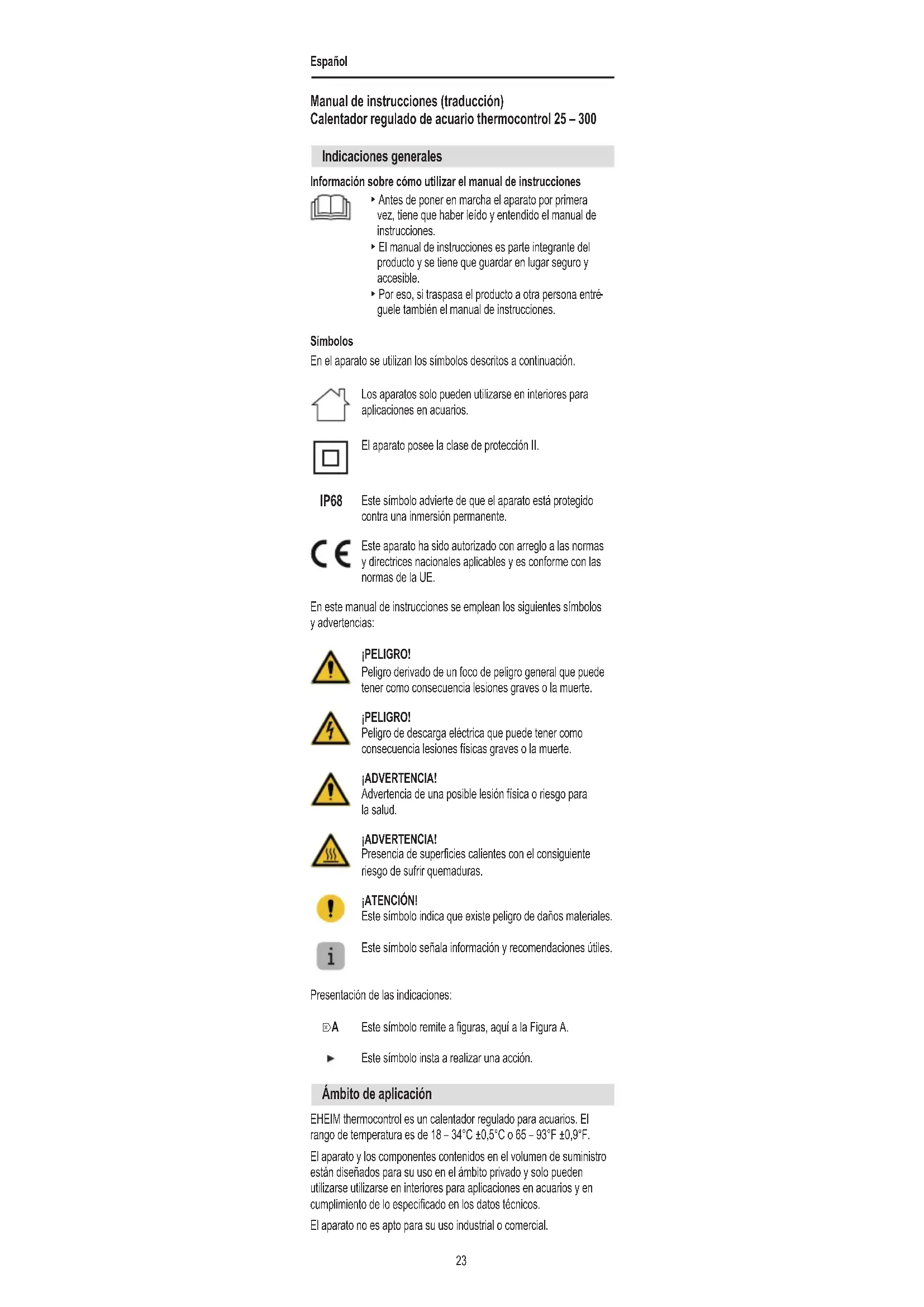 guele también el manual de instrucciones. Símbolos En el aparato se utilizan los símbolos descritos a continuación. Los aparatos solo pueden utilizarse en interiores para aplicaciones en acuarios. El aparato posee la clase de protección II. IP68 Este símbolo advierte de que el aparato está protegido contra una inmersión permanente. Este aparato ha sido autorizado con arreglo a las normas y directrices nacionales aplicables y es conforme con las normas de la UE. En este manual de instrucciones se emplean los siguientes símbolos y advertencias: ¡PELIGRO! Peligro derivado de un foco de peligro general que puede tener como consecuencia lesiones graves o la muerte. ¡PELIGRO! Peligro de descarga eléctrica que puede tener como consecuencia lesiones físicas graves o la muerte. ¡ADVERTENCIA! Advertencia de una posible lesión física o riesgo para la salud. ¡ADVERTENCIA! Presencia de supercies calientes con el consiguiente riesgo de sufrir quemaduras. ¡ATENCIÓN! Este símbolo indica que existe peligro de daños materiales. Este símbolo señala información y recomendaciones útiles. Presentación de las indicaciones: Este símbolo remite a guras, aquí a la Figura A. Este símbolo insta a realizar una acción.