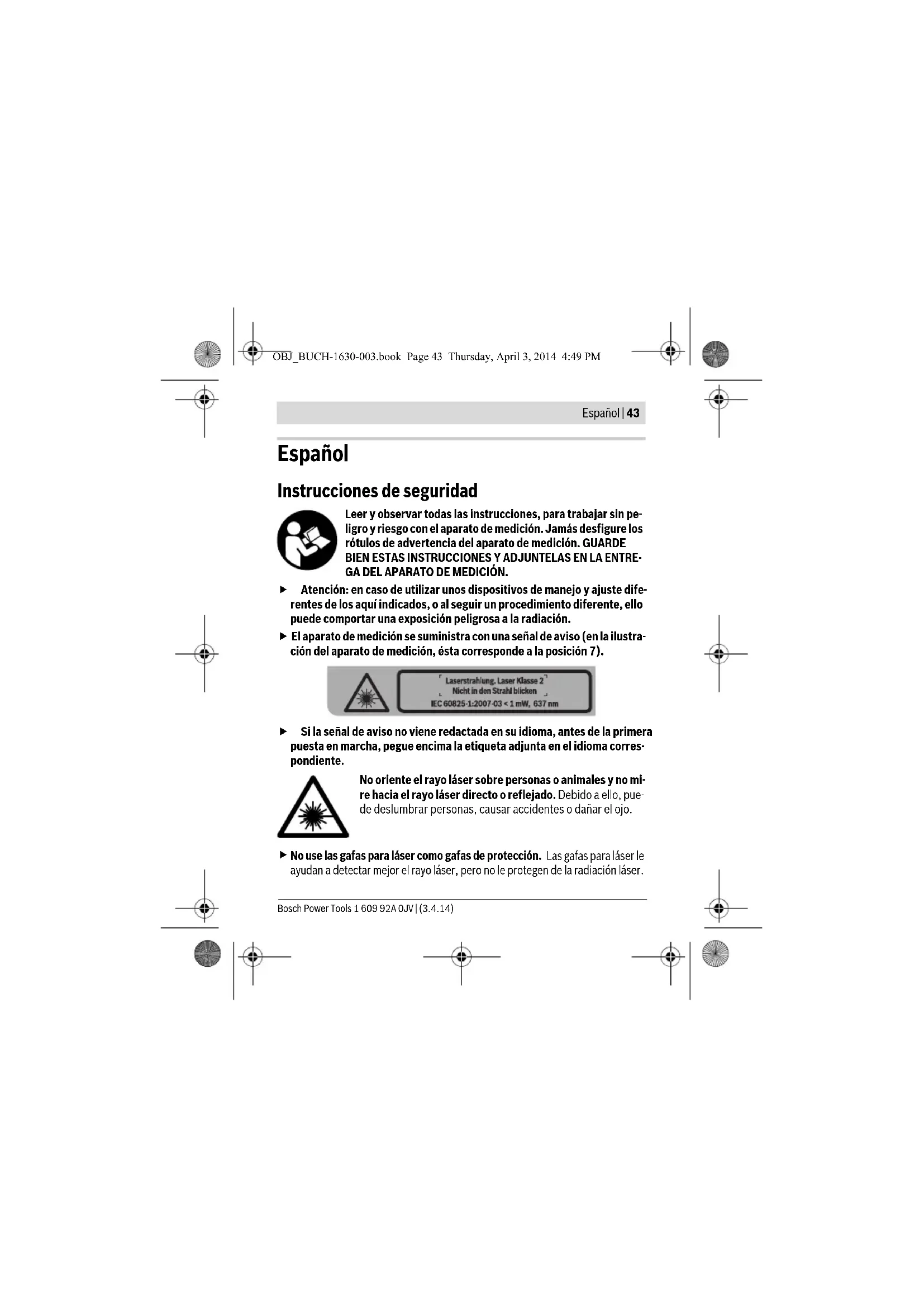 No use las gafas para láser como gafas de protección. Las gafas para láser le ayudan a detectar mejor el rayo láser, pero no le protegen de la radiación láser. OBJ_BUCH-1630-003.book Page 43 Thursday, April 3, 2014 4:49 PM1 609 92A 0JV | (3.4.14) Bosch Power Tools 44 | Español Si la radiación láser incide en el ojo, debe cerrar conscientemente los ojos y mover inmediatamente la cabeza fuera del rayo. No emplee las gafas para láser como gafas de sol ni para circular. Las ga- fas para láser no le protegen suficientemente contra los rayos ultravioleta y además no le permiten apreciar correctamente los colores. No efectúe modificaciones en el equipamiento del láser. Únicamente haga reparar su aparato de medición por un profesional, em- pleando exclusivamente piezas de repuesto originales. Solamente así se mantiene la seguridad del aparato de medición. No deje que los niños puedan utilizar desatendidos el aparato de medi- ción por láser. Podrían deslumbrar, sin querer, a otras personas. No utilice el aparato de medición en un entorno con peligro de explosión, en el que se encuentren combustibles líquidos, gases o material en pol- vo. El aparato de medición puede producir chispas e inflamar los materiales en polvo o vapores. No coloque el aparato de medición cerca de personas que utilicen un marcapasos. El campo magnético que produce el imán que integra el aparato de medición puede perturbar el funcionamiento de los marcapasos. Mantenga el aparato de medición alejado de soportes de datos magnéti- cos y de aparatos sensibles a los campos magnéticos. El campo magnético del imán puede causar una pérdida de datos irreversible. OBJ_BUCH-1630-003.book Page 44 Thursday, April 3, 2014 4:49 PMEspañol | 45 Bosch Power Tools 1 609 92A 0JV | (3.4.14) Descripción y prestaciones del producto Utilización reglamentaria El aparato de medición ha sido diseñado para trazar y controlar líneas horizonta- les y verticales. El aparato de medición es apto para ser utilizado exclusivamente en recintos cerrados. Componentes principales La numeración de los componentes está referida a la imagen del aparato de me- dición en la página ilustrada. 1 Abertura de salida del rayo láser 2 Interruptor de conexión/desconexión 3 Símbolo de la pila/alarma de nivelación 4 Fijación para trípode 1/4" 5 Enclavamiento de la tapa del alojamiento de las pilas 6 Tapa del alojamiento de las pilas 7 Señal de aviso láser 8 Placa de adaptación del soporte 9 Tornillo de 1/4" del soporte 10 Tornillo de fijación del soporte 11 Tornillo de sujeción del soporte 12 Soporte 13 Gafas para láser* 14 Trípode* 15 Número de serie