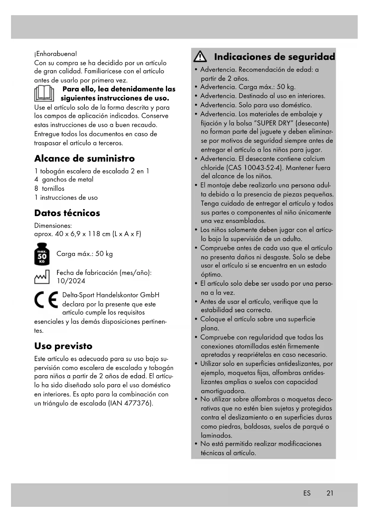 ¡Enhorabuena! Con su compra se ha decidido por un artículo de gran calidad. Familiarícese con el artículo antes de usarlo por primera vez. Para ello, lea detenidamente las siguientes instrucciones de uso. Use el artículo solo de la forma descrita y para los campos de aplicación indicados. Conserve estas instrucciones de uso a buen recaudo. Entregue todos los documentos en caso de traspasar el artículo a terceros. Alcance de suministro 1 tobogán escalera de escalada 2 en 1 4 ganchos de metal 8 tornillos 1 instrucciones de uso Datos técnicos Dimensiones: aprox. 40 x 6,9 x 118 cm (L x A x F) Carga máx.: 50 kg Fecha de fabricación (mes/año): 10/2024 Delta-Sport Handelskontor GmbH declara por la presente que este artículo cumple los requisitos esenciales y las demás disposiciones pertinen- tes. Uso previsto Este artículo es adecuado para su uso bajo su- pervisión como escalera de escalada y tobogán para niños a partir de 2 años de edad. El artícu- lo ha sido diseñado solo para el uso doméstico en interiores. Es apto para la combinación con un triángulo de escalada (IAN 477376). Indicaciones de seguridad