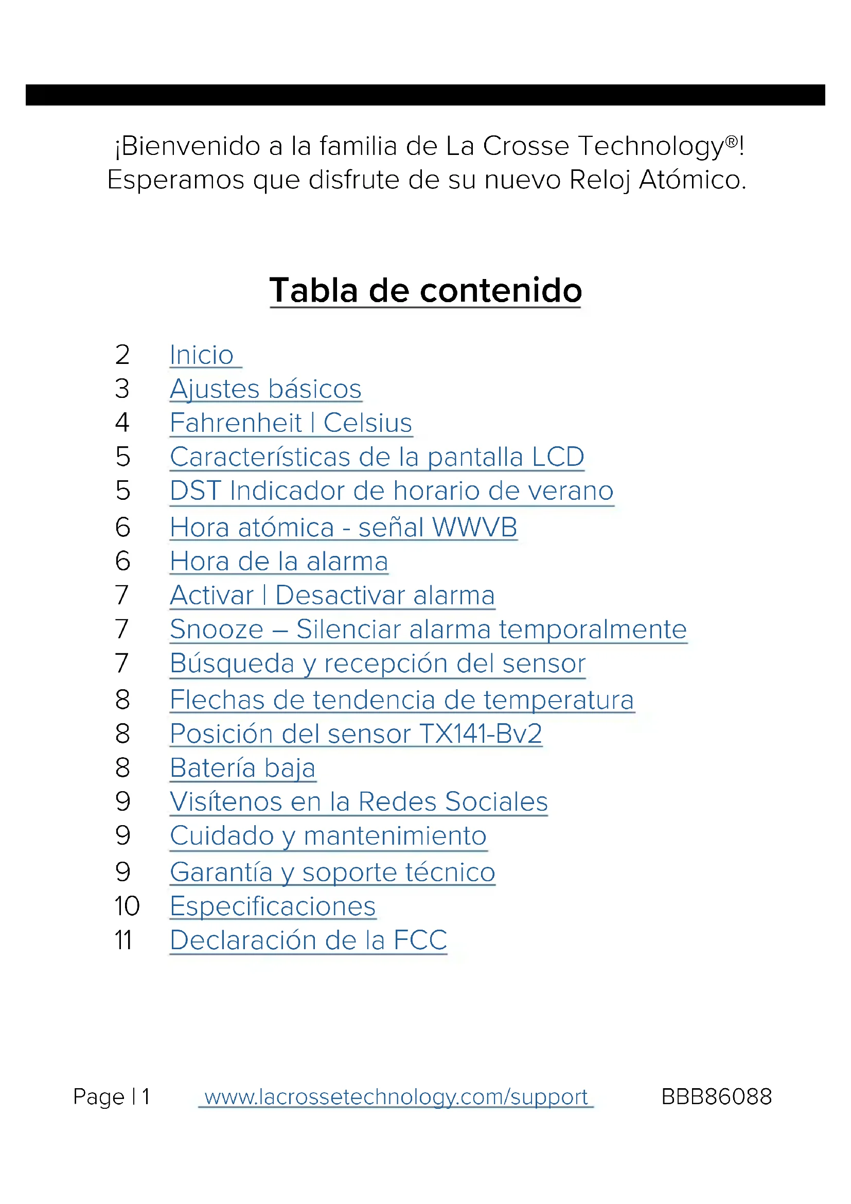 TEMPERATURA INTERIOR / EXTERIORTabla de contenido Page | 1 www.lacrossetechnology.com/support BBB86088 Inicio Ajustes básicos Fahrenheit | Celsius Características de la pantalla LCD DST Indicador de horario de verano Hora atómica - señal WWVB Hora de la alarma Activar | Desactivar alarma Snooze – Silenciar alarma temporalmente Búsqueda y recepción del sensor Flechas de tendencia de temperatura Posición del sensor TX141-Bv2 Batería baja Visítenos en la Redes Sociales Cuidado y mantenimiento Garantía y soporte técnico Especificaciones Declaración de la FCC