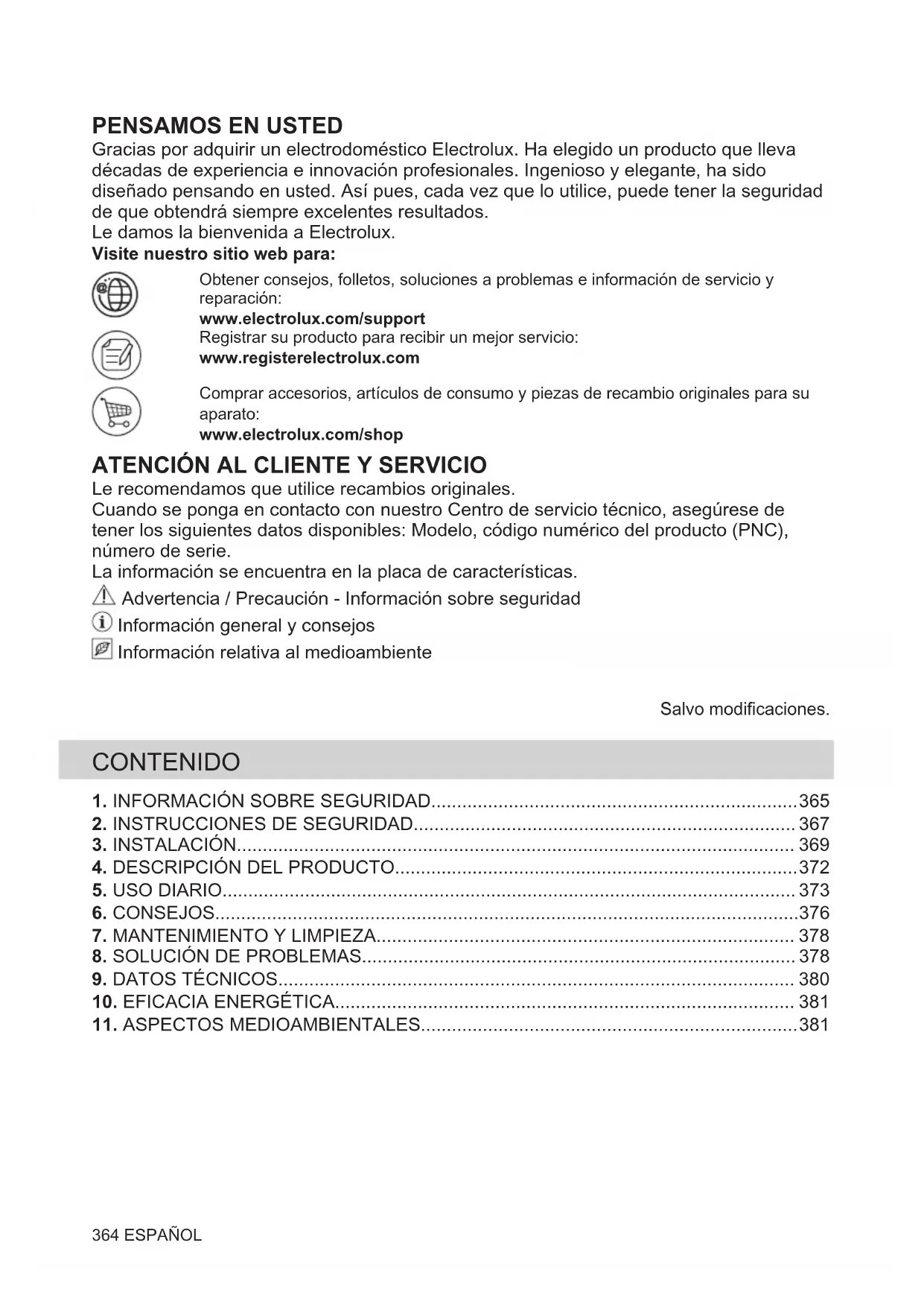 Le recomendamos que utilice recambios originales. Cuando se ponga en contacto con nuestro Centro de servicio técnico, asegúrese de tener los siguientes datos disponibles: Modelo, código numérico del producto (PNC), número de serie. La información se encuentra en la placa de características. Advertencia / Precaución - Información sobre seguridad Información general y consejos Información relativa al medioambiente Salvo modificaciones. CONTENIDO