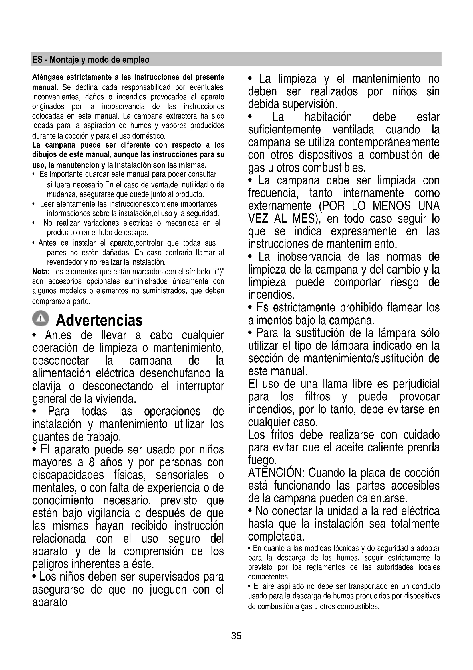 - Antes de instalar el aparato,controlar que todas sus partes no estèn dañadas. En caso contrario llamar al revendedor y no realizar la instalaciòn. Nota: Los elementos que están marcados con el símbolo "(*)" son accesorios opcionales suministrados únicamente con algunos modelos o elementos no suministrados, que deben comprarse a parte. Advertencias