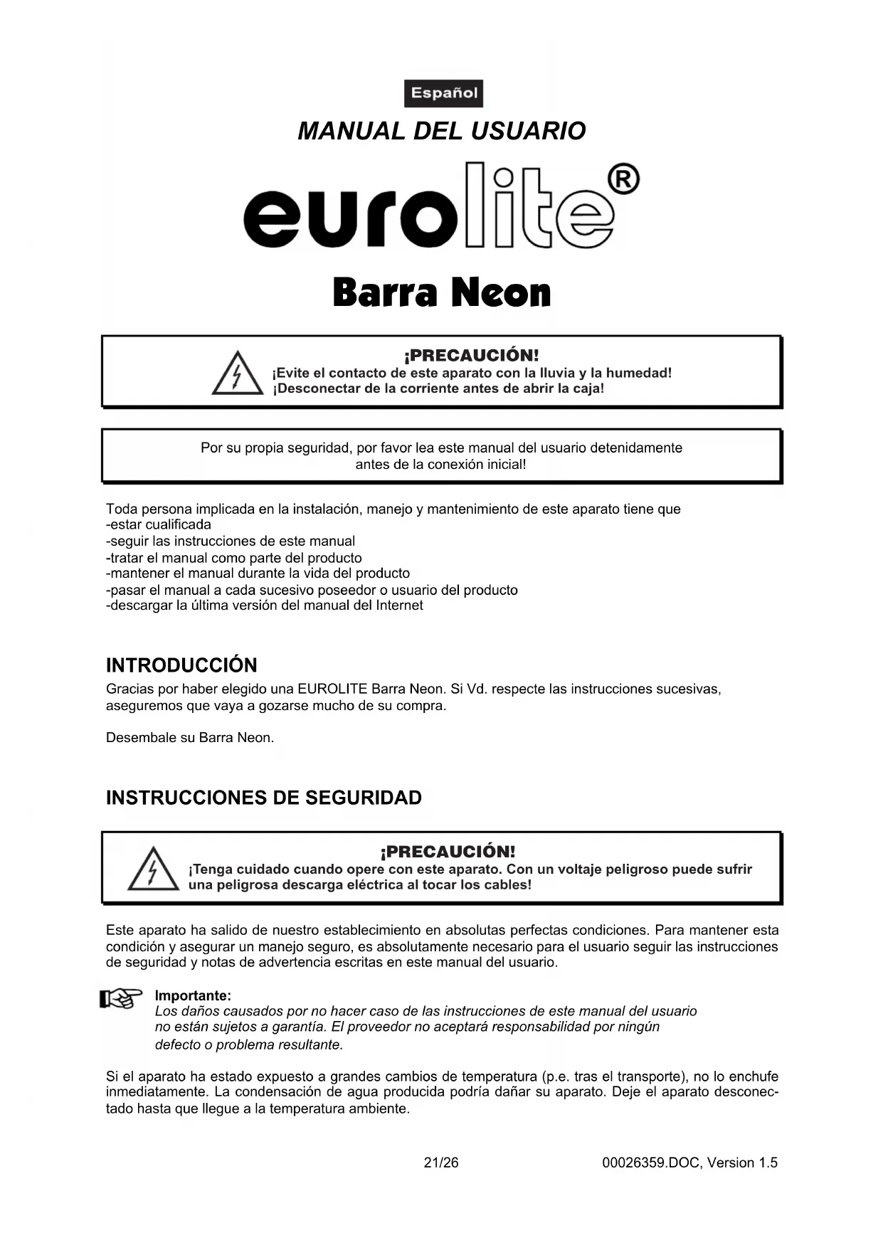 ¡Tenga cuidado cuando opere con este aparato. Con un voltaje peligroso puede sufrir una peligrosa descarga eléctrica al tocar los cables! ¡PRECAUCIÓN! Este aparato ha salido de nuestro establecimiento en absolutas perfectas condiciones. Para mantener esta condición y asegurar un manejo seguro, es absolutamente necesario para el usuario seguir las instrucciones de seguridad y notas de advertencia escritas en este manual del usuario. Importante: Los daños causados por no hacer caso de las instrucciones de este manual del usuario no están sujetos a garantía. El proveedor no aceptará responsabilidad por ningún defecto o problema resultante. Si el aparato ha estado expuesto a grandes cambios de temperatura (p.e. tras el transporte), no lo enchufe inmediatamente. La condensación de agua producida podría dañar su aparato. Deje el aparato desconec- tado hasta que llegue a la temperatura ambiente.00026359.DOC, Version 1.5 22/26 ¡No deje que el cable de alimentación entre en contacto con otros cables! ¡Maneje los cables de corriente alterna y las conexiones de corriente alterna con mucha precaución! Asegúrese de que la tensión de alimentación no es mayor que la indicada en el aparato. Preste atención que el cable de alimentación no esté aplastado o pueda estar atravesado por algún tipo de superficie afilada. Compruebe el estado del aparato y del cable regularmente. La boquilla del cable u el conector del aparato no debe ser cargado con tracción. Siempre debe haber una longura suficiente de cable al aparato. Otra vez, el cable puede ser estropeado que puede causar un golpe eléctrico mortal. Cuando Vd. utilice prolongaciones, asegúrese de que el sección de los conectores está suficiente pare el corriente del aparato. Todas las instrucciones del cable de alimentación deben ser respectadas. Desconecte el aparato de la red cuando no vaya a ser utilizado y antes de limpiarlo. Maneje el cable únicamente por el enchufe. No desenchufe el aparato de la red tirando del cable de alimentación. Otra vez, el cable u la clavija puede ser estropeado que puede causar un golpe electríco mortal. Si enchufes o interruptores no son accesibles, el aparato debe ser desconectado de la red. Desconecte el aparato de la red cuando hay polvo en la clavija u el aparato. Limpie el aparato con un paño suave y húmedo. Polvo puede reducir la insulación que puede causar un golpe electríco mortal. Poluciones mas graves deben ser removidos por un especialista. Líquido de todas formas deben nunca entrar en enchufes, conectores u algunos orificios del aparato. Cuando supone que líquido puede haber entrado en el aparato, desenchufe el aparato inmediatamente. También cuando el aparato se ha encontrado en un ambiente muy humedo. El aparato debe ser controlado por un especialista si insulaciones están reducidos a causa del líquido. Insulaciones reducidos pueden causar un golpe eléctrico mortal. Piezas de todas formas deben nunca entrar en el aparato - especialmente piezas de metal. Cuando supone que piezas de metal pueden haber entrado en el aparato, desenchufe el aparato inmediatamente. Malfunciones o cortocircuitos pueden causar un golpe eléctrico mortal. Durante la puesta en marcha inicial puede aparecer olor o humo. Este es un proceso normal y no significa necesariamente que el aparato sea defectuoso. Este aparato pertenece a la clase de protección II. Este aparato tiene un aislamiento de protección. Durante la puesta en marcha inicial puede aparecer olor o humo. Este es un proceso normal y no significa necesariamente que el aparato sea defectuoso. Atención: ¡No toque la caja del aparato durante su operación (la caja se caliente)! No haga efecto de flash con el aparato ya que ésto reduciría la vida de la lámpara. ¡PELIGRO PARA LA SALUD! ¡No mirar directamente a la fuente de luz, las personas sensibles pueden recibir un shock epiléptico (especialmente dirigido a los epilépticos)! Manténgalo lejos del alcance de los niños y de personal no profesional. Nunca operar el aparato sin observación.