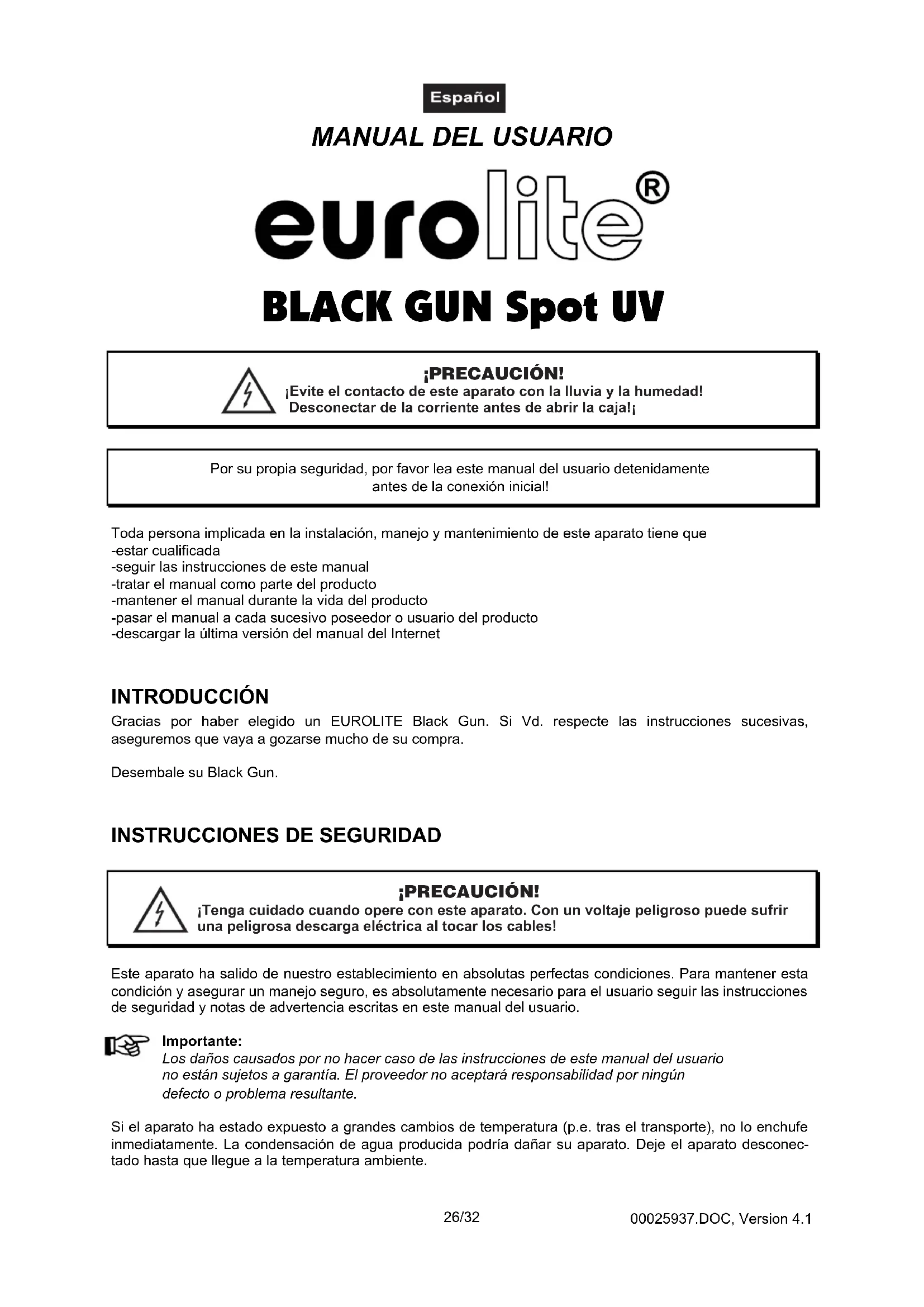 BLACK GUN Spot UV ¡Eviteelcontactodeesteaparatoconlalluviaylahumedad!Desconectardelacorrienteantesdeabrirlacaja!¡ ¡PRECAUCIÓN! Por su propia seguridad, por favor lea este manual del usuario detenidamenteantes de la conexión inicial!Toda persona implicada en la instalación, manejo y mantenimiento de este aparato tiene que-estar cualificada-seguir las instrucciones de este manual-tratar el manual como parte del producto-mantener el manual durante la vida del producto-pasar el manual a cada sucesivo poseedor o usuario del producto-descargar la última versión del manual del Internet INTRODUCCIÓN Gracias por haber elegido un EUROLITE Black Gun. Si Vd. respecte las instrucciones sucesivas,aseguremos que vaya a gozarse mucho de su compra.Desembale su Black Gun.
