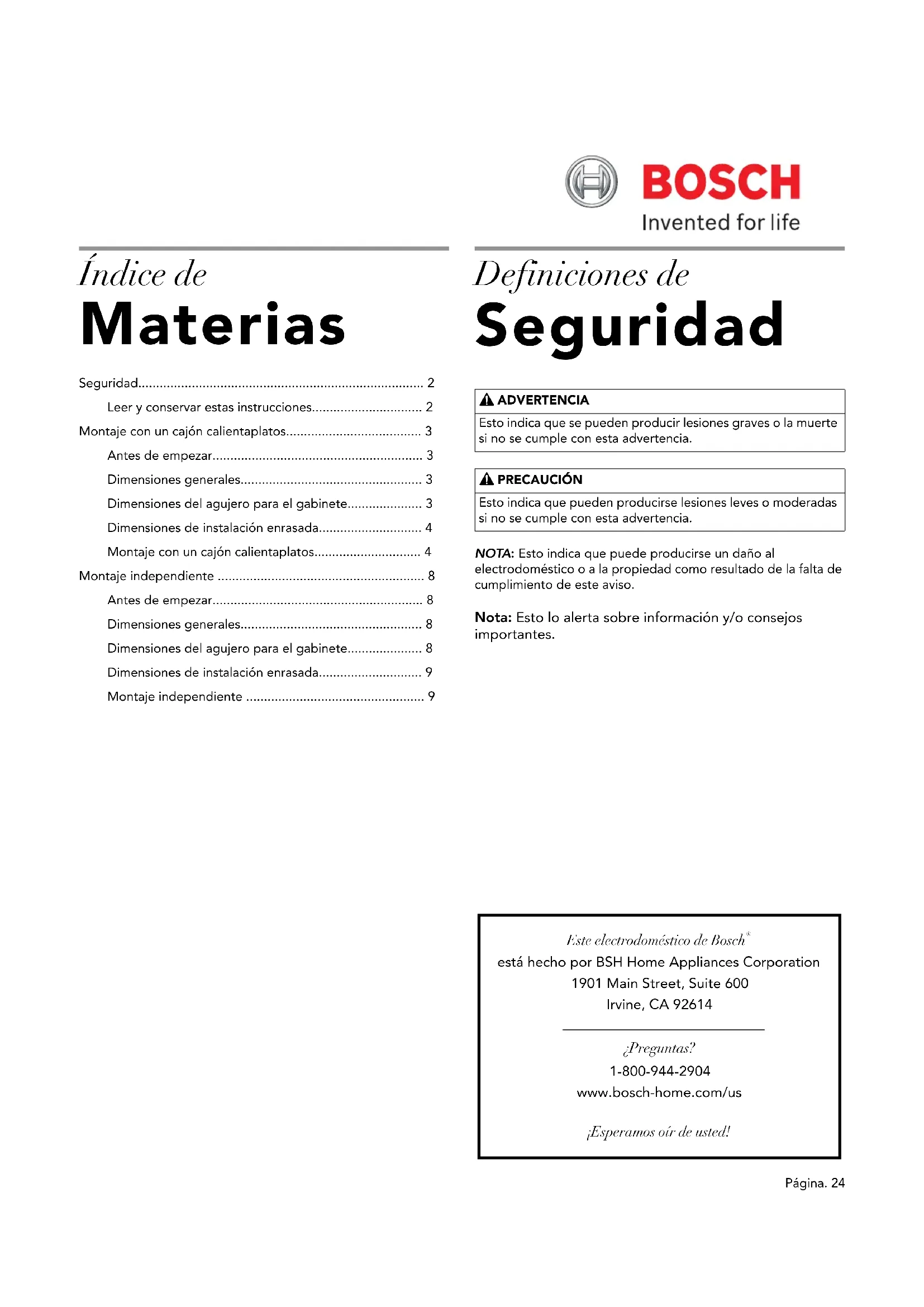 - está hecho por BSH Home Appliances Corporation 1901 Main Street, Suite 600 Irvine, CA 92614 ¿Preguntas? 1-800-944-2904 www.bosch-home.com/us ¡Esperamos oír de usted! Índice de Materias Seguridad p. 2