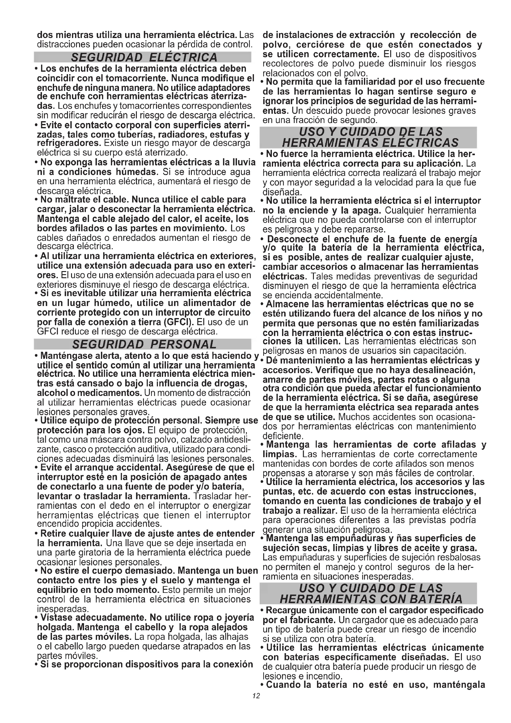 - Mantenga a los niños y a los espectadores aleja-12 dos mientras utiliza una herramienta eléctrica. Las distracciones pueden ocasionar la pérdida de control.