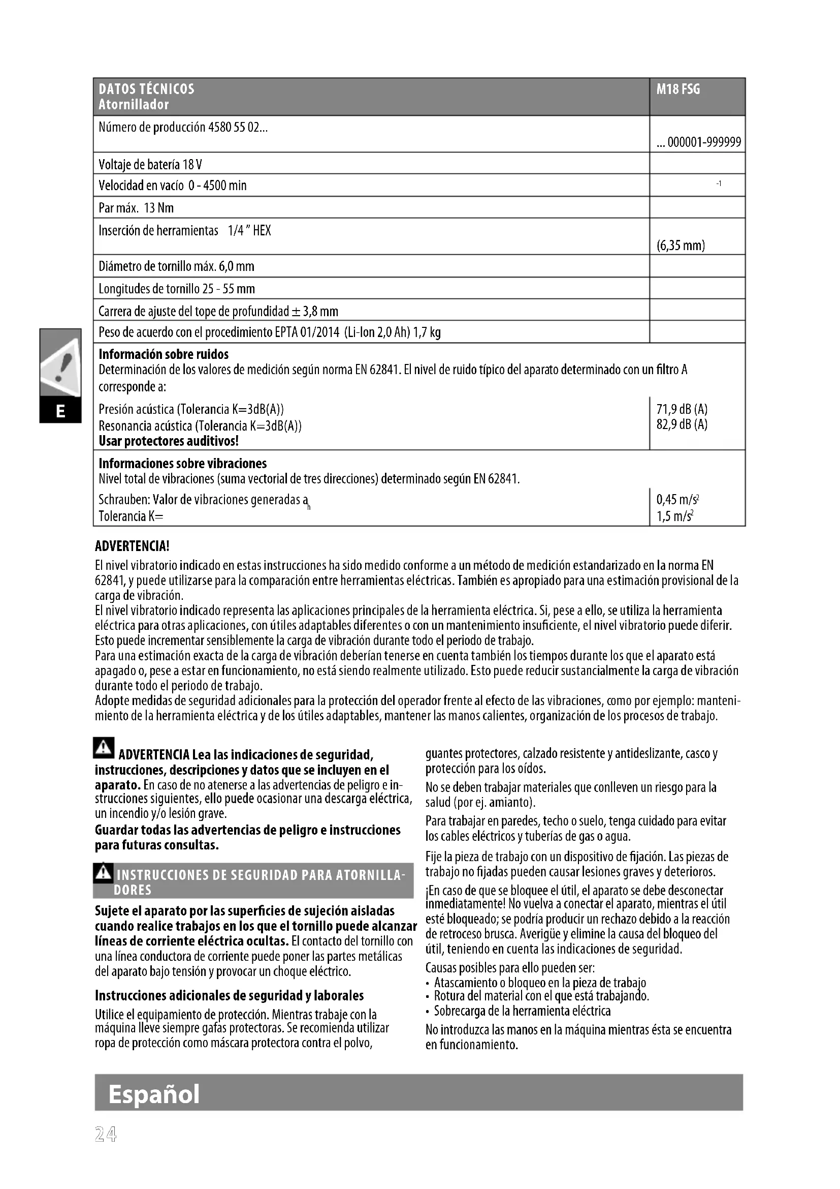 Atornillador M18 FSG Número de producción 4580 55 02... ... 000001-999999 Voltaje de batería 18 V Velocidad en vacío 0 - 4500 min