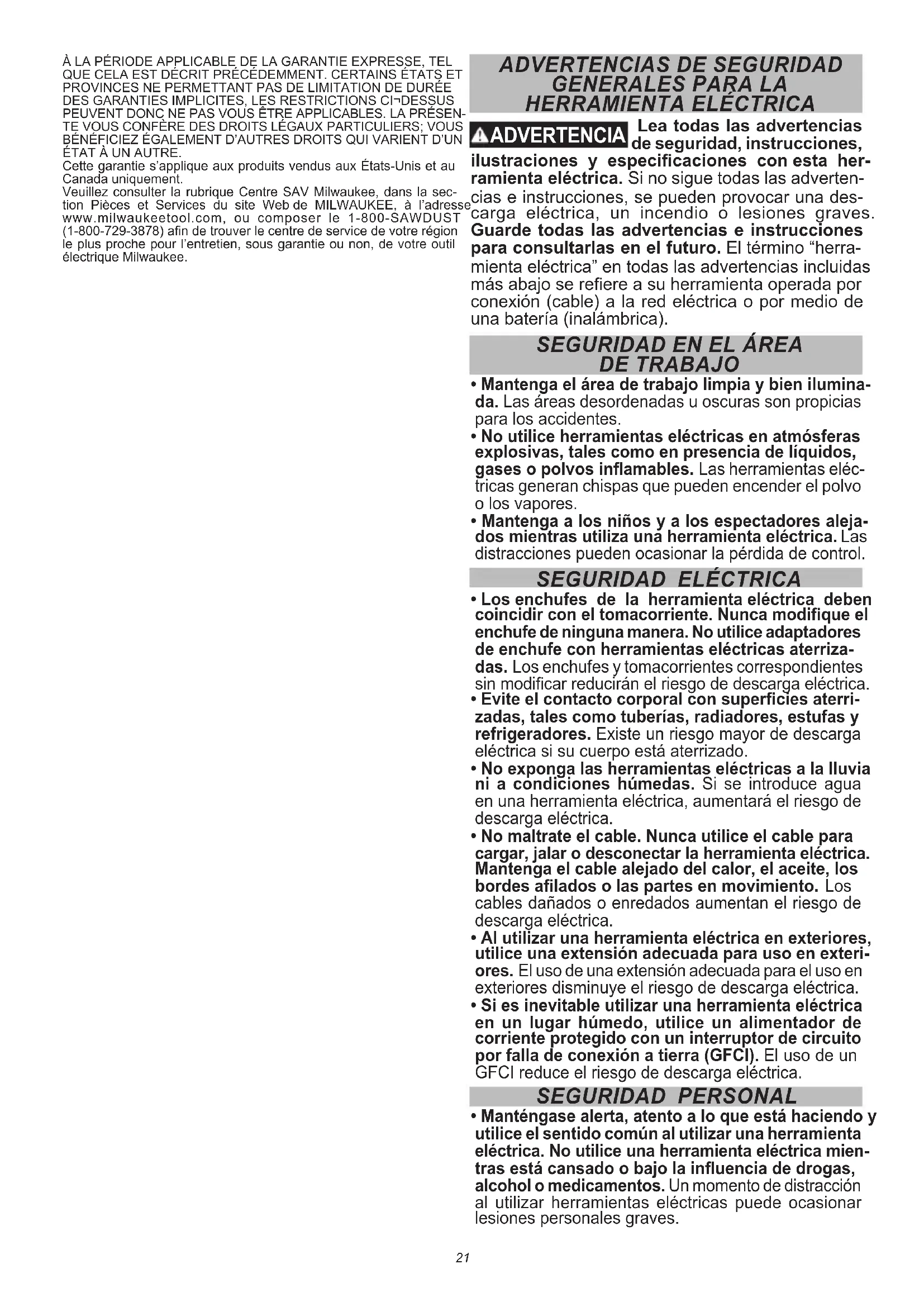 Techtronic Industries Mexico, S.A. de C.V. Av. Presidente Masarik 29 Piso 7 11560 Polanco V Seccion Miguel Hidalgo, Distrito Federal, México 01 (800) 030-7777 o (55) 4160-3540 Lunes a Viernes (9am a 6pm) O contáctanos en www.milwaukeetool.com.mx GARANTÍA LIMITADA - E.U.A. Y CANADÁ Cada herramienta eléctrica* de MILWAUKEE (ver excepciones a continuación) está garantizada para el comprador original únicamente de que no tenga material y mano de obra defectuosos. Sujeto a ciertas excepciones, MILWAUKEE reparará o reemplazará cualquier parte en una herramienta eléctrica que tenga defectos de material o mano de obra según lo determine MILWAUKEE mediante una revisión, por un periodo de cinco (5) años** después de la fecha de compra a menos que se indique lo contrario. Al devolver la herramienta eléctrica a un Centro de Servicio de la fábrica de MILWAUKEE o a una Estación de Servicio Autorizada de MILWAUKEE, se requiere que el ete esté pagado por adelantado y asegurado. Se debe incluir una copia del comprobante de compra con el producto devuelto. Esta garantía no aplica a daños que MILWAUKEE determine que son ocasionados por reparaciones o intentos de reparaciones realizados por una persona que no sea personal autorizado de MILWAUKEE, uso indebido, alteraciones, maltrato, desgaste normal, falta de mantenimiento o accidentes. Desgaste normal: Muchas herramientas eléctricas necesitan un reemplazo periódico de partes y servicio para lograr el mejor des- empeño. Esta garantía no cubre la reparación cuando el uso normal ha agotado la vida de una parte, incluyendo sin limitar a mandriles, cepillos, cables, zapatas de la sierra, abrazaderas de la hoja, anillos en O, sellos, protectores, hojas de desatornilladores, pistones, herrajes, levantadores y arandelas de cubierta de los protectores. *Esta garantía no cubre clavadoras y grapadoras neumáticas, pistola de pintura a presión, baterías inalámbricas, generadores de energía portátil de gasolina, herramientas de mano, palanca y cadena de mano de polipasto - eléctricas, indumentaria calefactada M12™, producto reacondicionado y productos de prueba y medición. Existen garantías por separado y distintas disponibles para estos productos. **El periodo de garantía para los radios para obra, puerto de energía M12™, fuente de poder M18™, ventiladores para obra y carretillas de trabajo industrial Trade Titan™ es de un (1) año a partir de la fecha de compra. El período de garantía para los M18 FUEL™ 1" llaves de impacto de alto torque con d en empuñadura, cables de limpieza de drenaje y AIRSNAKE™ los accesorios de pistola de aire de limpieza de drenaje, y los niveles láser mediante USB REDLITHIUM