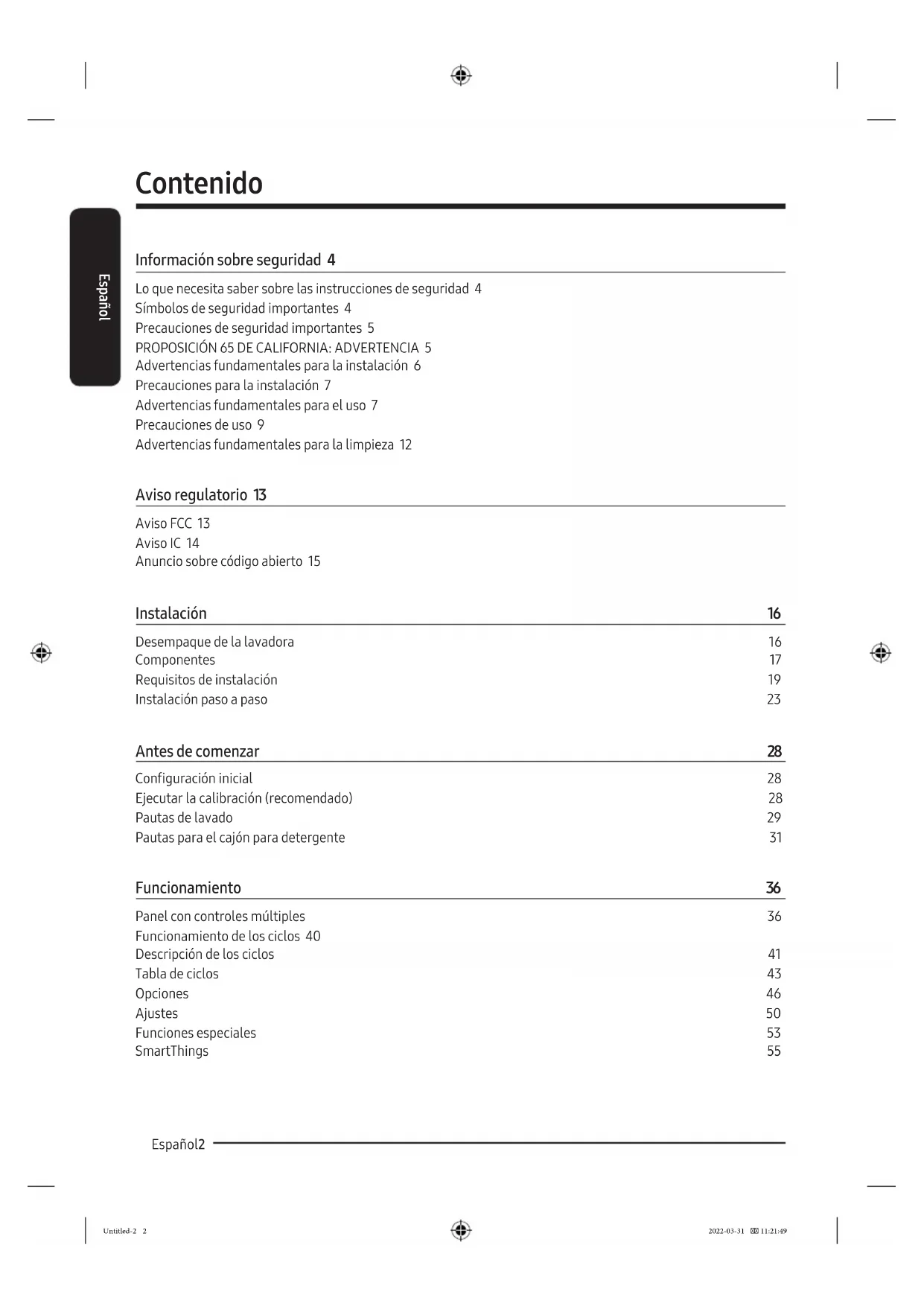 Advertencias fundamentales para la instalación 6 Precauciones para la instalación 7 Advertencias fundamentales para el uso 7 Precauciones de uso 9 Advertencias fundamentales para la limpieza 12 Aviso regulatorio 13 Aviso FCC 13 Aviso IC 14 Anuncio sobre código abierto 15 Instalación 16 Desempaque de la lavadora 16 Componentes 17 Requisitos de instalación 19 Instalación paso a paso 23 Antes de comenzar 28 Conguración inicial 28 Ejecutar la calibración (recomendado) 28 Pautas de lavado 29 Pautas para el cajón para detergente 31 Funcionamiento 36 Panel con controles múltiples 36 Funcionamiento de los ciclos 40 Descripción de los ciclos 41 Tabla de ciclos 43 Opciones 46 Ajustes 50 Funciones especiales 53 SmartThings 55 Untitled-2 2 2022-03-31 11:21:49Español Español 3 Mantenimiento 56 Limpiar+ 56 Drenaje de emergencia 57 Limpieza 58 Recuperación de un congelamiento 62 Mantenimiento luego de un período prolongado sin utilizar la lavadora 62 Limpieza del exterior 63 Limpieza del interior 63 Solución de problemas 64 Vericaciones 64 Códigos de información 69 Especicaciones 71 Tabla de indicaciones sobre telas 71 Protección del medio ambiente 72 Declaración de conformidad 72 Hoja de especicaciones 73 Untitled-2 3 2022-03-31 11:21:49Español