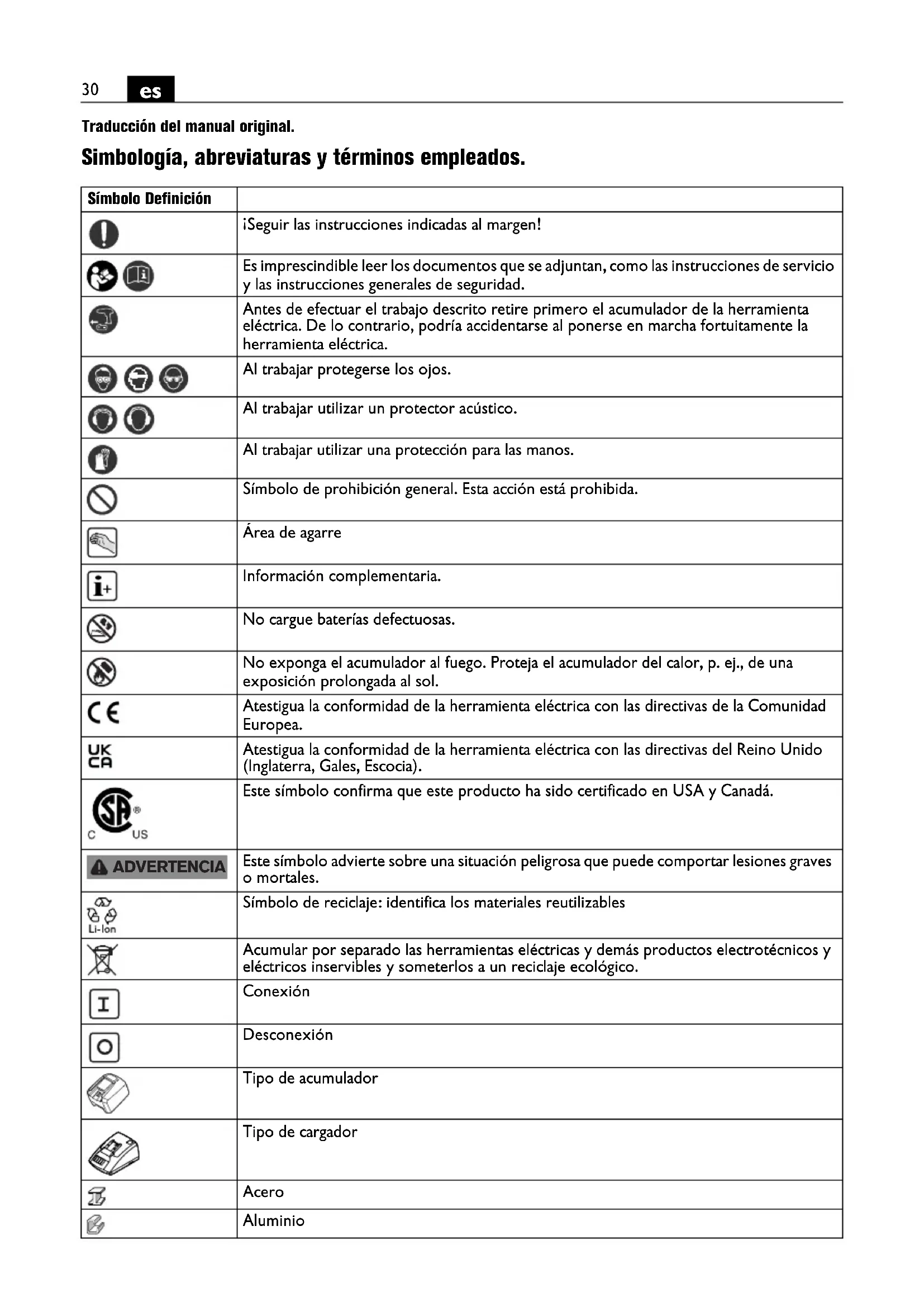 Traducción del manual original. Simbología, abreviaturas y términos empleados. Símbolo Definición ¡Seguir las instrucciones indicadas al margen! Es imprescindible leer los documentos que se adjuntan, como las instrucciones de servicio y las instrucciones generales de seguridad. Antes de efectuar el trabajo descrito retire primero el acumulador de la herramienta eléctrica. De lo contrario, podría accidentarse al ponerse en marcha fortuitamente la herramienta eléctrica. Al trabajar protegerse los ojos. Al trabajar utilizar un protector acústico. Al trabajar utilizar una protección para las manos. Símbolo de prohibición general. Esta acción está prohibida. Área de agarre Información complementaria. No cargue baterías defectuosas. No exponga el acumulador al fuego. Proteja el acumulador del calor, p. ej., de una exposición prolongada al sol. Atestigua la conformidad de la herramienta eléctrica con las directivas de la Comunidad Europea. Atestigua la conformidad de la herramienta eléctrica con las directivas del Reino Unido (Inglaterra, Gales, Escocia). Este símbolo confirma que este producto ha sido certificado en USA y Canadá. Este símbolo advierte sobre una situación peligrosa que puede comportar lesiones graves o mortales. Símbolo de reciclaje: identifica los materiales reutilizables Acumular por separado las herramientas eléctricas y demás productos electrotécnicos y eléctricos inservibles y someterlos a un reciclaje ecológico. Conexión Desconexión Tipo de acumulador Tipo de cargador Acero Aluminio ADVERTENCIA31