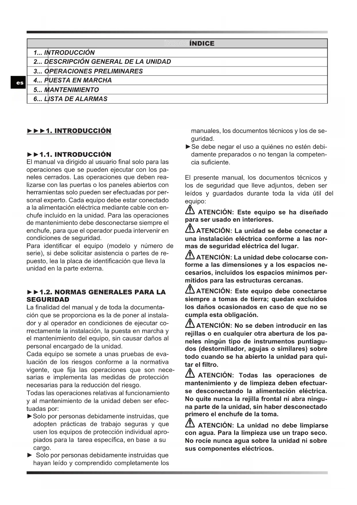 SEGURIDAD La nalidad del manual y de toda la documenta- ción que se proporciona es la de poner al instala- dor y al operador en condiciones de ejecutar co- rrectamente la instalación, la puesta en marcha y el mantenimiento del equipo, sin causar daños al personal encargado de la unidad. Cada equipo se somete a unas pruebas de eva- luación de los riesgos conforme a la normativa vigente, que ja las operaciones que son nece- sarias e implementa las medidas de protección necesarias para la reducción del riesgo. Todas las operaciones relativas al funcionamiento y al mantenimiento de la unidad deben ser efec- tuadas por: ►Solo por personas debidamente instruidas, que adopten prácticas de trabajo seguras y que usen los equipos de protección individual apro- piados para la tarea especíca, en base a su cargo. ► Solo por personas debidamente instruidas que hayan leído y comprendido completamente los manuales, los documentos técnicos y los de se- guridad. ►Se debe negar el uso a quiénes no estén debi- damente preparados o no tengan la competen- cia suciente. El presente manual, los documentos técnicos y los de seguridad que lleve adjuntos, deben ser leídos y guardados durante toda la vida útil del equipo: ATENCIÓN: Este equipo se ha diseñado para ser usado en interiores. ATENCIÓN: La unidad se debe conectar a una instalación eléctrica conforme a las nor- mas de seguridad eléctrica del lugar. ATENCIÓN: La unidad debe colocarse con- forme a las dimensiones y a los espacios ne- cesarios, incluidos los espacios mínimos per- mitidos para las estructuras cercanas. ATENCIÓN: Este equipo debe conectarse siempre a tomas de tierra; quedan excluidos los daños ocasionados en caso de que no se cumpla esta obligación. ATENCIÓN: No se deben introducir en las rejillas o en cualquier otra abertura de los pa- neles ningún tipo de instrumentos puntiagu- dos (destornillador, agujas o similares) sobre todo cuando se ha abierto la unidad para qui- tar el ltro. ATENCIÓN: Todas las operaciones de mantenimiento y de limpieza deben efectuar- se desconectando la alimentación eléctrica. No quite nunca la rejilla frontal ni abra ningu- na parte de la unidad, sin haber desconectado primero el enchufe de la toma. ATENCIÓN: La unidad no debe limpiarse con agua. Para la limpieza use un trapo seco. No rocíe nunca agua sobre la unidad ni sobre sus componentes eléctricos.