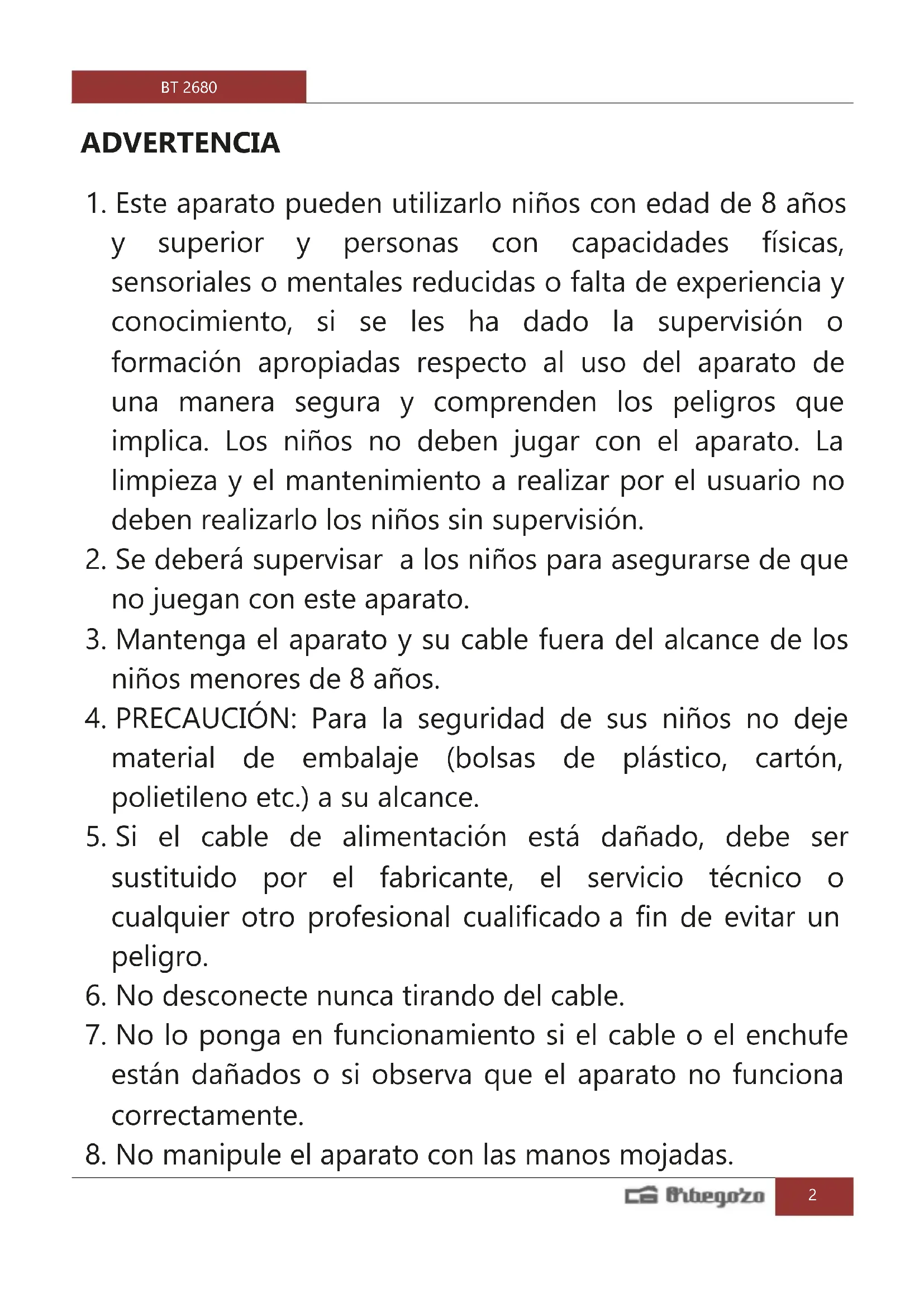 MANUAL DE USUARIO BT 2680 Orbegozo