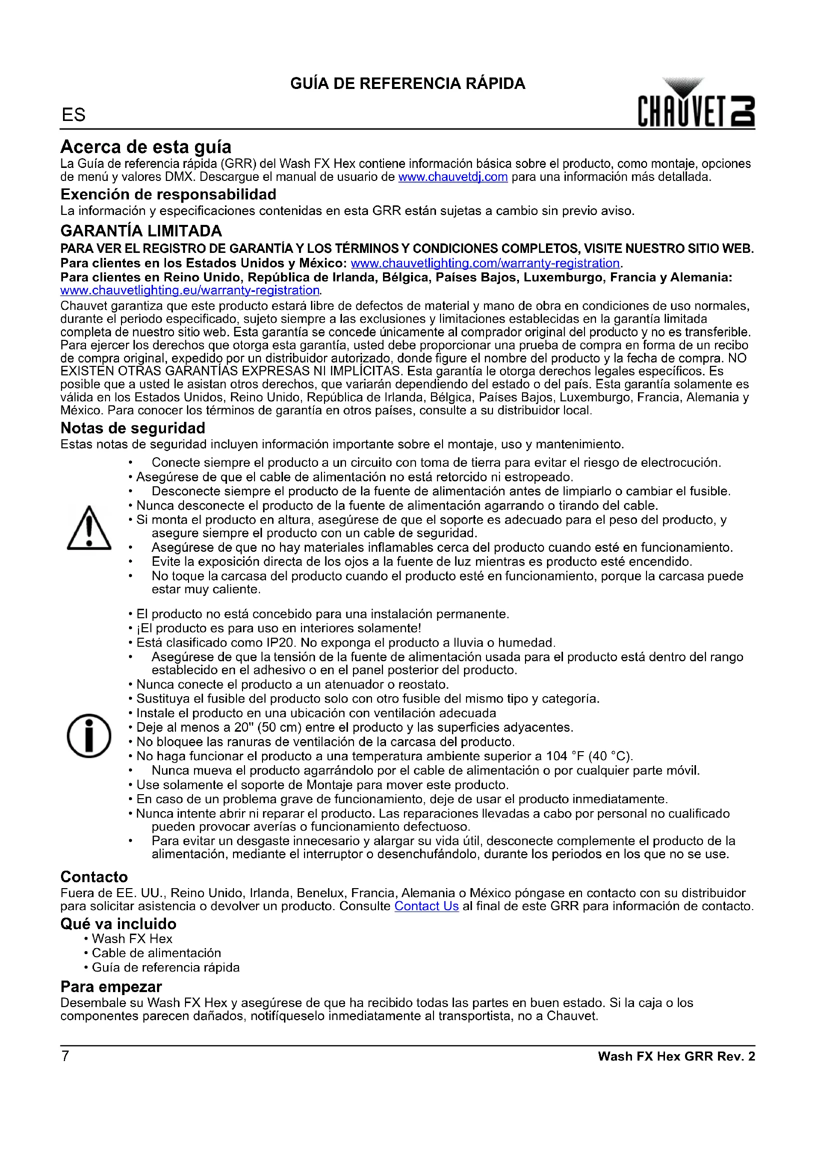 Chauvet garantiza que este producto estará libre de defectos de material y mano de obra en condiciones de uso normales, durante el periodo especificado, sujeto siempre a las exclusiones y limitaciones establecidas en la garantía limitada completa de nuestro sitio web. Esta garantía se concede únicamente al comprador original del producto y no es transferible. Para ejercer los derechos que otorga esta garantía, usted debe proporcionar una prueba de compra en forma de un recibo de compra original, expedido por un distribuidor autorizado, donde figure el nombre del producto y la fecha de compra. NO EXISTEN OTRAS GARANTÍAS EXPRESAS NI IMPLÍCITAS. Esta garantía le otorga derechos legales específicos. Es posible que a usted le asistan otros derechos, que variarán dependiendo del estado o del país. Esta garantía solamente es válida en los Estados Unidos, Reino Unido, República de Irlanda, Bélgica, Países Bajos, Luxemburgo, Francia, Alemania y México. Para conocer los términos de garantía en otros países, consulte a su distribuidor local. Notas de seguridad Estas notas de seguridad incluyen información importante sobre el montaje, uso y mantenimiento. Contacto Fuera de EE. UU., Reino Unido, Irlanda, Benelux, Francia, Alemania o México póngase en contacto con su distribuidor para solicitar asistencia o devolver un producto. Consulte Contact Us al final de este GRR para información de contacto. Qué va incluido Para empezar Desembale su Wash FX Hex y asegúrese de que ha recibido todas las partes en buen estado. Si la caja o los componentes parecen dañados, notifíqueselo inmediatamente al transportista, no a Chauvet.
