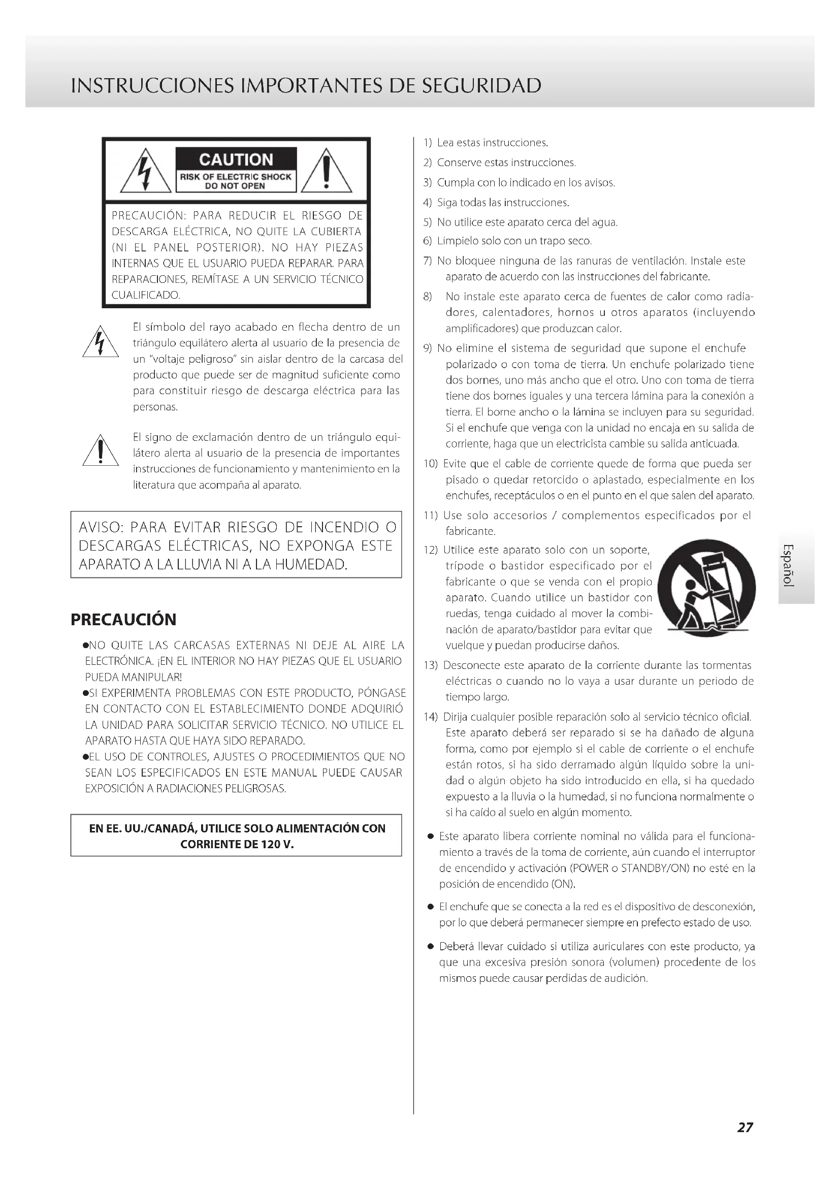 APARATO A LA LLUVIA NI A LA HUMEDAD. PRECAUCIÓN o NO QUITE LAS CARCASAS EXTERNAS NI DEJE AL AIRE LA ELECTRÓNICA. ¡EN EL INTERIOR NO HAY PIEZAS QUE EL USUARIO PUEDA MANIPULAR! o SI EXPERIMENTA PROBLEMAS CON ESTE PRODUCTO, PÓNGASE EN CONTACTO CON EL ESTABLECIMIENTO DONDE ADQUIRIÓ LA UNIDAD PARA SOLICITAR SERVICIO TÉCNICO. NO UTILICE EL APARATO HASTA QUE HAYA SIDO REPARADO. o EL USO DE CONTROLES, AJUSTES O PROCEDIMIENTOS QUE NO SEAN LOS ESPECIFICADOS EN ESTE MANUAL PUEDE CAUSAR EXPOSICIÓN A RADIACIONES PELIGROSAS.EN EE. UU./CANADÁ, UTILICE SOLO ALIMENTACIÓN CON CORRIENTE DE 120 V.1) Lea estas instrucciones.2) Conserve estas instrucciones.3) Cumpla con lo indicado en los avisos.4) Siga todas las instrucciones.5) No utilice este aparato cerca del agua.6) Límpielo solo con un trapo seco.7) No bloquee ninguna de las ranuras de ventilación. Instale este aparato de acuerdo con las instrucciones del fabricante.