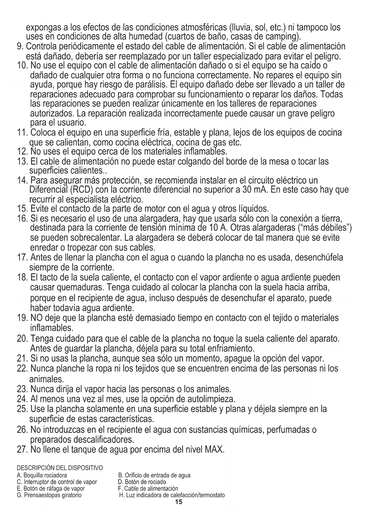 17. Antes de llenar la plancha con el agua o cuando la plancha no es usada, desenchúfela
