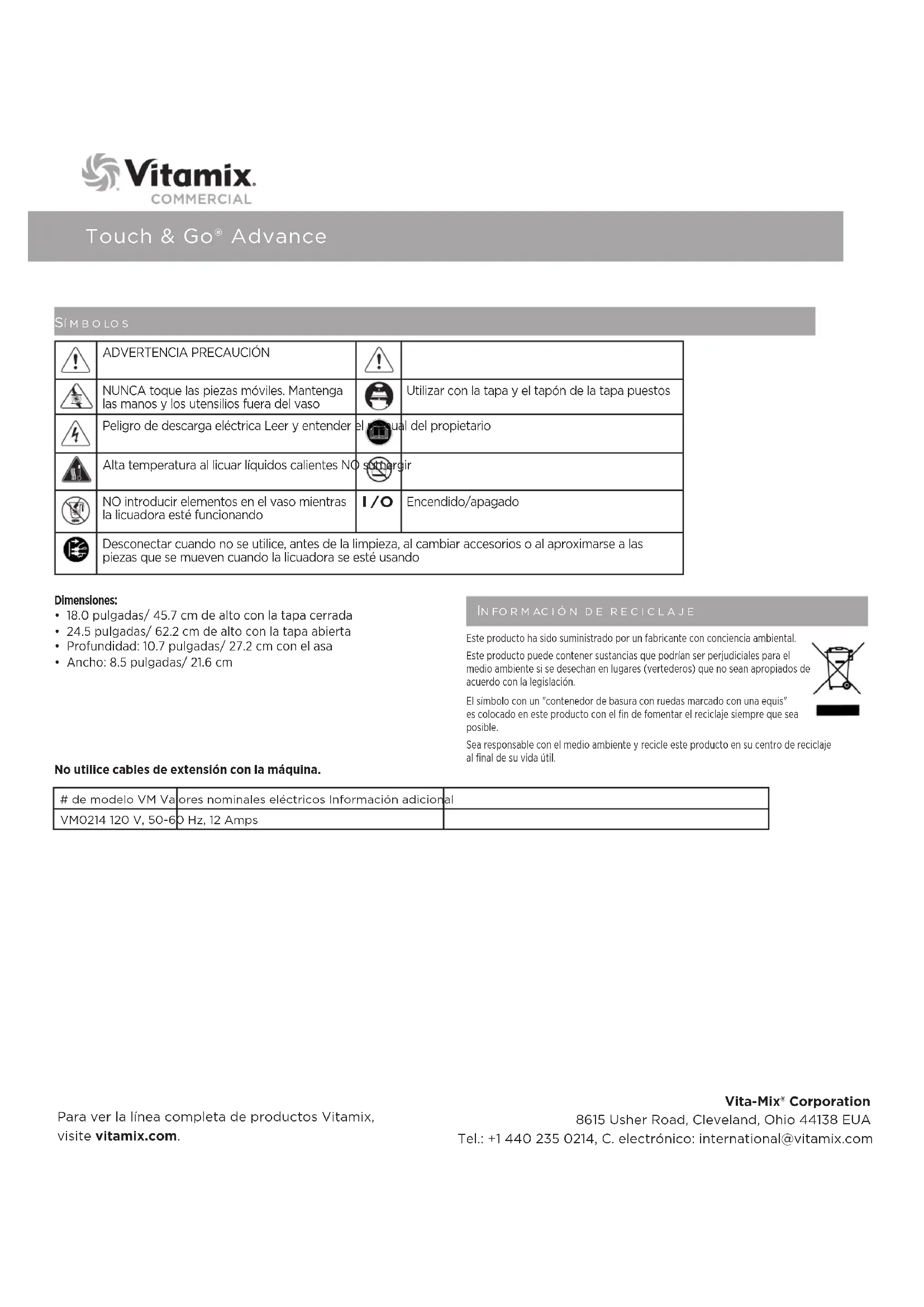 - Ancho: 8.5 pulgadas/ 21.6 cm No utilice cables de extensión con la máquina. Este producto ha sido suministrado por un fabricante con conciencia ambiental.Este producto puede contener sustancias que podrían ser perjudiciales para el medio ambiente si se desechan en lugares (vertederos) que no sean apropiados de acuerdo con la legislación.El símbolo con un "contenedor de basura con ruedas marcado con una equis" es colocado en este producto con el fin de fomentar el reciclaje siempre que sea posible.Sea responsable con el medio ambiente y recicle este producto en su centro de reciclaje al final de su vida útil. in fo R m ac i ó n d e R e c i c l a j e # de modelo VM Valores nominales eléctricos Información adicionalVM0214 120 V, 50-60 Hz, 12 Amps Vita-Mix® Corporation 8615 Usher Road, Cleveland, Ohio 44138 EUA Tel.: +1 440 235 0214, C. electrónico: international@vitamix.com22 LEA ESTE MANUAL Y TODAS LAS INSTRUCCIONES ANTES DE UTILIZAR ESTE PRODUCTO. EL NO SEGUIR LAS INSTRUCCIONES Y LAS PRECAUCIONES DE SEGURIDAD DE ESTE MANUAL PODRÍA PROVOCAR LESIONES GRAVES O DAÑOS MATERIALES.