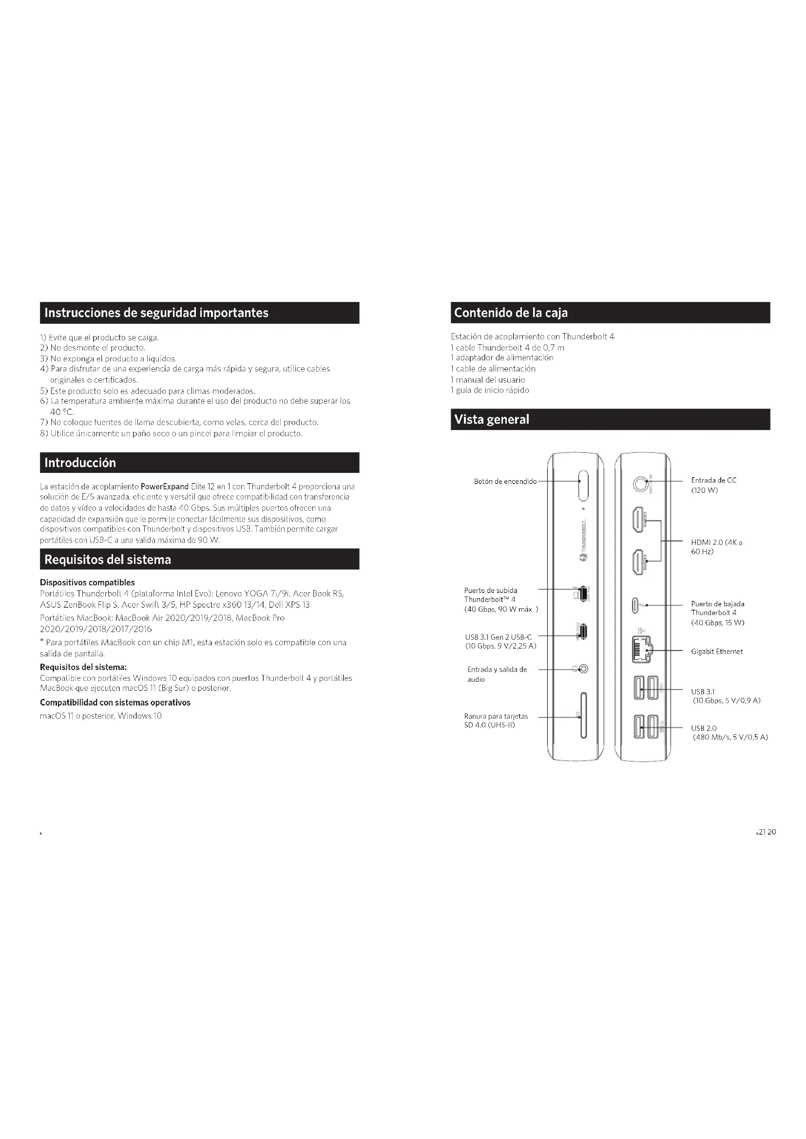 | Características técnicas | 12 puertos, incluyendo Thunderbolt 4, USB-C, USB-A, HDMI, Ethernet, lector de tarjetas SD |