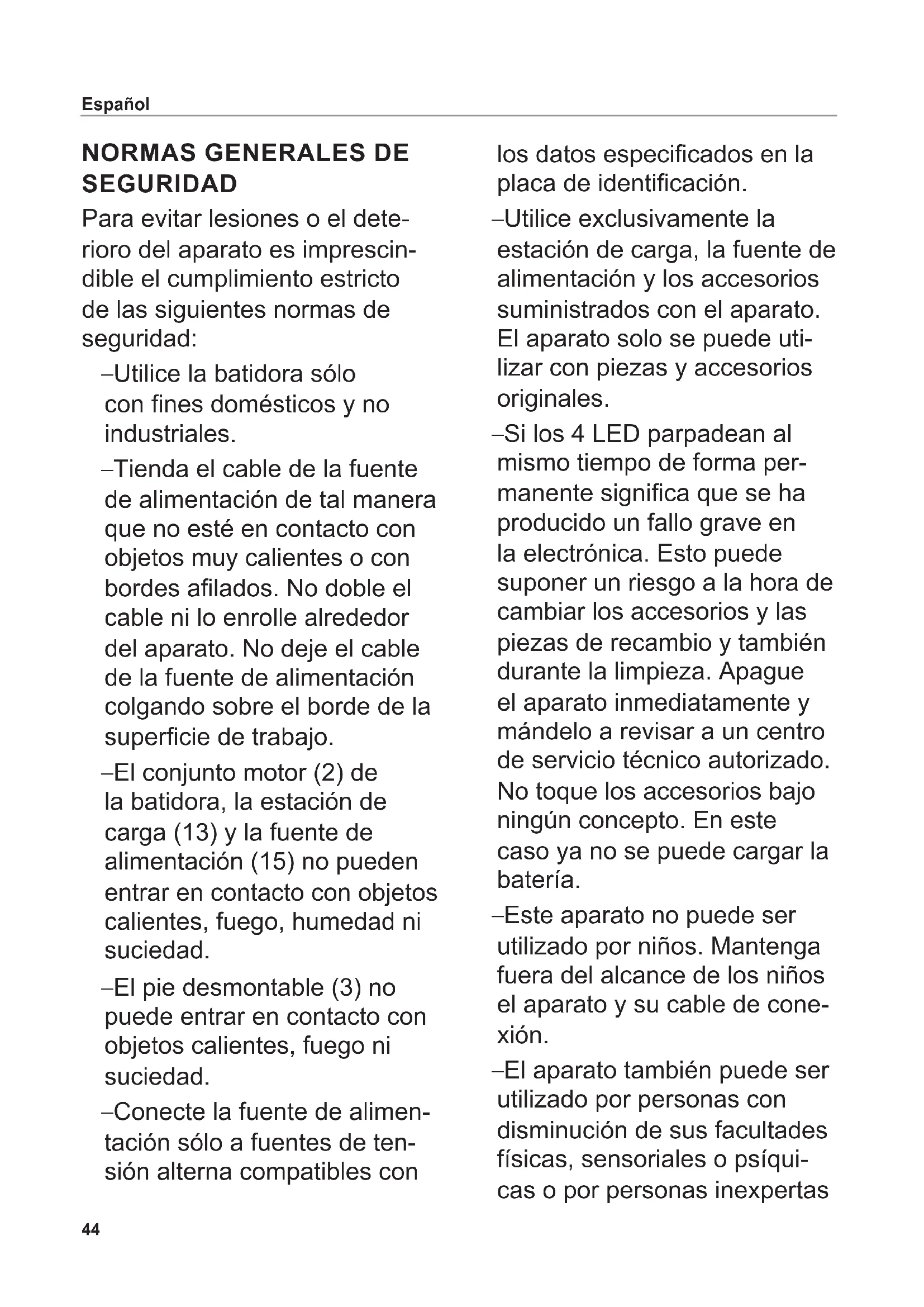 SEGURIDAD Para evitar lesiones o el dete- rioro del aparato es imprescin- dible el cumplimiento estricto de las siguientes normas de seguridad: – Utilice la batidora sólo con nes domésticos y no industriales. – Tienda el cable de la fuente de alimentación de tal manera que no esté en contacto con objetos muy calientes o con bordes alados. No doble el cable ni lo enrolle alrededor del aparato. No deje el cable de la fuente de alimentación colgando sobre el borde de la supercie de trabajo. – El conjunto motor (2) de la batidora, la estación de carga (13) y la fuente de alimentación (15) no pueden entrar en contacto con objetos calientes, fuego, humedad ni suciedad. – El pie desmontable (3) no puede entrar en contacto con objetos calientes, fuego ni suciedad. – Conecte la fuente de alimen- tación sólo a fuentes de ten- sión alterna compatibles con los datos especicados en la placa de identicación. – Utilice exclusivamente la estación de carga, la fuente de alimentación y los accesorios suministrados con el aparato. El aparato solo se puede uti- lizar con piezas y accesorios originales. – Si los 4 LED parpadean al mismo tiempo de forma per- manente signica que se ha producido un fallo grave en la electrónica. Esto puede suponer un riesgo a la hora de cambiar los accesorios y las piezas de recambio y también durante la limpieza. Apague el aparato inmediatamente y mándelo a revisar a un centro de servicio técnico autorizado. No toque los accesorios bajo ningún concepto. En este caso ya no se puede cargar la batería. – Este aparato no puede ser utilizado por niños. Mantenga fuera del alcance de los niños el aparato y su cable de cone- xión. – El aparato también puede ser utilizado por personas con disminución de sus facultades físicas, sensoriales o psíqui- cas o por personas inexpertas Español45 siempre y cuando lo hagan bajo supervisión o se les haya instruido sobre la manipu- lación segura del aparato y sobre sus posibles riesgos. – Impida que los niños jueguen con el aparato. – Ponga en marcha la batidora solo cuando se encuentre en el interior de un recipiente con el fondo plano. – No introduzca la batidora en el alimento por encima de la unión entre el conjunto motor y el pie desmontable. – Vigile el aparato en todo momento cuando esté funcionando. – No sumerja nunca la bati- dora, la estación de carga ni la fuente de alimentación en agua ni en otros líquidos. No exponga nunca el aparato a la acción de la lluvia o de la humedad. Si el aparato hubiera caído al agua, primero desenchufe la fuente de ali- mentación de la estación de carga y después sáquelo del agua. Antes de volver a poner en funcionamiento el aparato, asegúrese de que lo revisa a fondo un servicio técnico autorizado. – No utilice el aparato con las manos húmedas. No lo utilice si está húmedo o mojado, o bien si usted se encuentra en un suelo húmedo. No utilice el aparato al aire libre. – Ni la batidora ni la estación de carga se pueden lavar en el lavavajillas. – Cuando la batidora está en marcha no toque nunca los accesorios ni introduzca en ellos ningún objeto. Riesgo de lesiones – Desenchufe siempre la fuente de alimentación de la toma de corriente en caso de fallos en el funcionamiento. Para ello tire del cuerpo del enchufe, no del cable. – En caso de desperfecto o avería en alguna pieza del aparato, desconéctelo inme- diatamente para evitar ries- gos. Antes de volver a poner en funcionamiento el aparato, asegúrese de que lo revisa a fondo un servicio técnico autorizado. – Si la fuente de alimentación o el cable de ésta está dañado deberá cambiar la fuente de alimentación por otra original Español46 que deberá solicitar al fabri- cante o a su servicio técnico autorizado en su país. – No encienda la batidora bajo ningún concepto cuando la esté limpiando, cuando retire o coloque las cuchillas o cuando cambie los accesorios y las piezas de recambio. Mantenga los dedos alejados de los botones. No toque los los de las cuchillas porque están muy aladas. – Mientras bate los alimentos pueden producirse salpicadu- ras. Para evitar escaldaduras deje que los alimentos se enfríen antes de procesarlos. Español – Retire la olla de la placa de cocción si va a utilizar la bati- dora en su interior. – Asegúrese de que la muesca de los accesorios encaja com- pletamente en la espiga del eje. Los accesorios que no se jan bien y quedan sueltos no se pueden utilizar y hay que cambiarlos. Peligro de explosión – Proteja las baterías del calor y del fuego. Cuadro de indicadores LED (6) LED Descripción Batidora en la estación de carga Apagado Batería totalmente cargada Parpadean de izquierda a derecha Se está cargando la batería, el último LED que parpadea muestra el nivel de carga Todos parpadean a la vez Error de manejo (aparato encendido en la estación de carga) Batidora fuera de la estación de carga Se iluminan 1, 2, 3 o 4 LED Se está utilizando el aparato, la cantidad de LED encendidos muestra el nivel de carga de la batería El LED 1 parpadea lentamente (1 s encendido/1 s apagado) Batería vacía El LED 1 destella brevemente (0,1 s encendido/1 s apagado) La batería está defectuosa (ver „CAMBIO DE LA BATERÍA“) Los 4 LED parpadean lentamente (1 s encendidos/1 s apagados) Protección contra sobrecarga (ver „FUNCIONES“)47 La batidora dispone de 3 niveles de velocidad. Un interruptor automático de protección contra sobrecarga se dispara automáticamente en los casos siguientes: – Sobrecalentamiento – Bloqueo de la cuchilla – Funcionamiento continuo durante más de 4 minutos