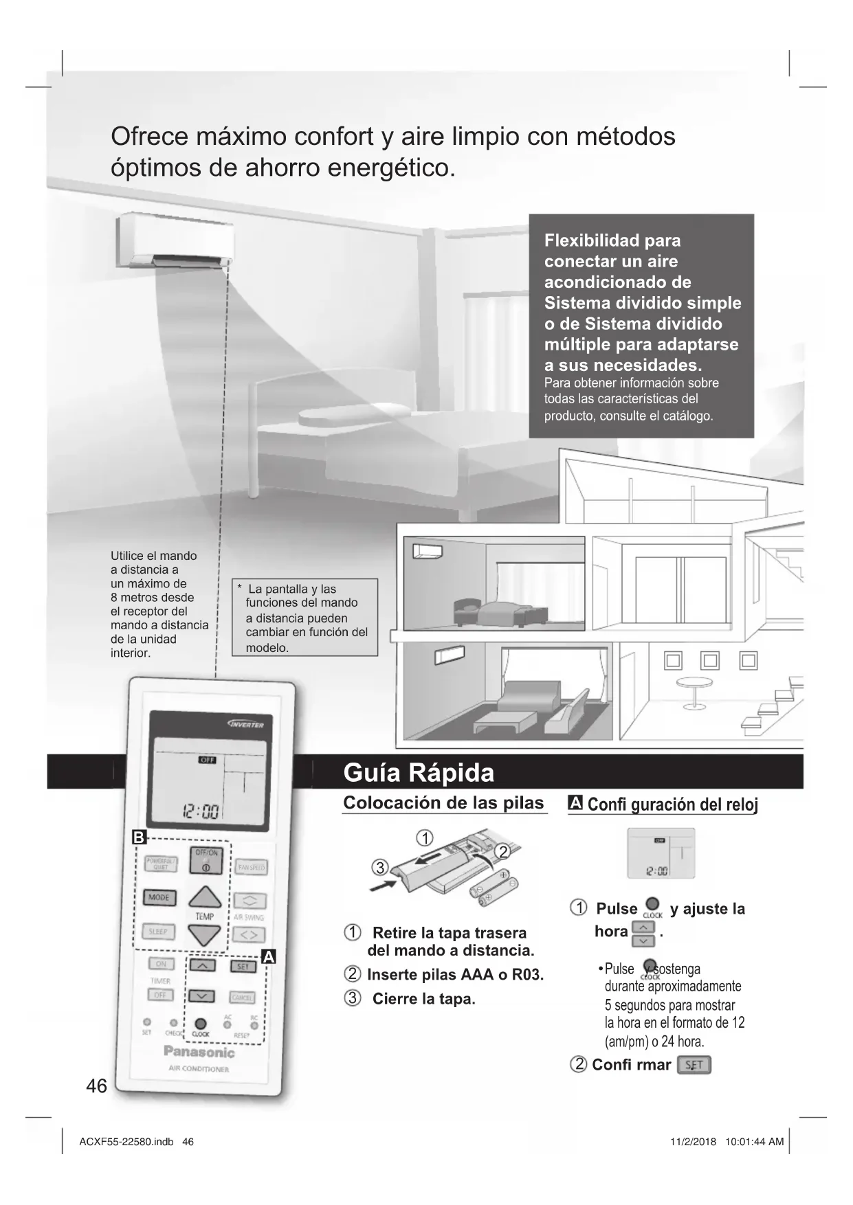- Certains codes erreur peuvent ne pas être applicables à votre modèle.Consultez un revendeur agréé pour plus d’explications. ACXF55-22580.indb 45ACXF55-22580.indb 45 11/2/2018 10:01:44 AM11/2/2018 10:01:44 AM46 Flexibilidad para conectar un aire acondicionado de Sistema dividido simple o de Sistema dividido múltiple para adaptarse a sus necesidades. Para obtener información sobre todas las características del producto, consulte el catálogo. Ofrece máximo confort y aire limpio con métodos óptimos de ahorro energético. Utilice el mando a distancia a un máximo de 8 metros desde el receptor del mando a distancia de la unidad interior. Guía Rápida Colocación de las pilas