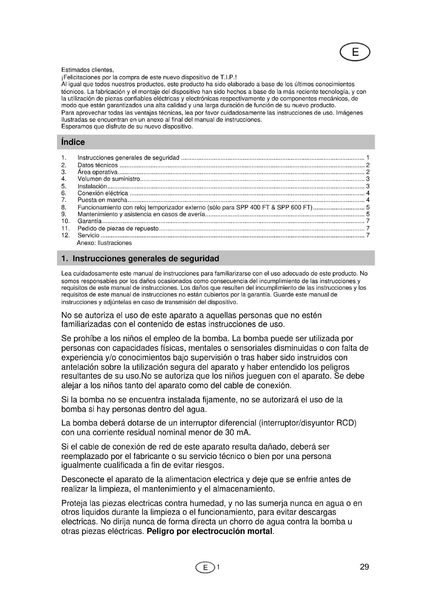 - Estimados clientes, ¡Felicitaciones por la compra de este nuevo dispositivo de T.I.P.! Al igual que todos nuestros productos, este producto ha sido elaborado a base de los últimos conocimientos técnicos. La fabricación y el montaje del dispositivo han sido hechos a base de la más reciente tecnología, y con la utilización de piezas confiables eléctricas y electrónicas respectivamente y de componentes mecánicos, de modo que están garantizados una alta calidad y una larga duración de función de su nuevo producto. Para aprovechar todas las ventajas técnicas, lea por favor cuidadosamente las instrucciones de uso. Imágenes ilustradas se encuentran en un anexo al final del manual de instrucciones. Esperamos que disfrute de su nuevo dispositivo. Índice 1. Instrucciones generales de seguridad p. 1
