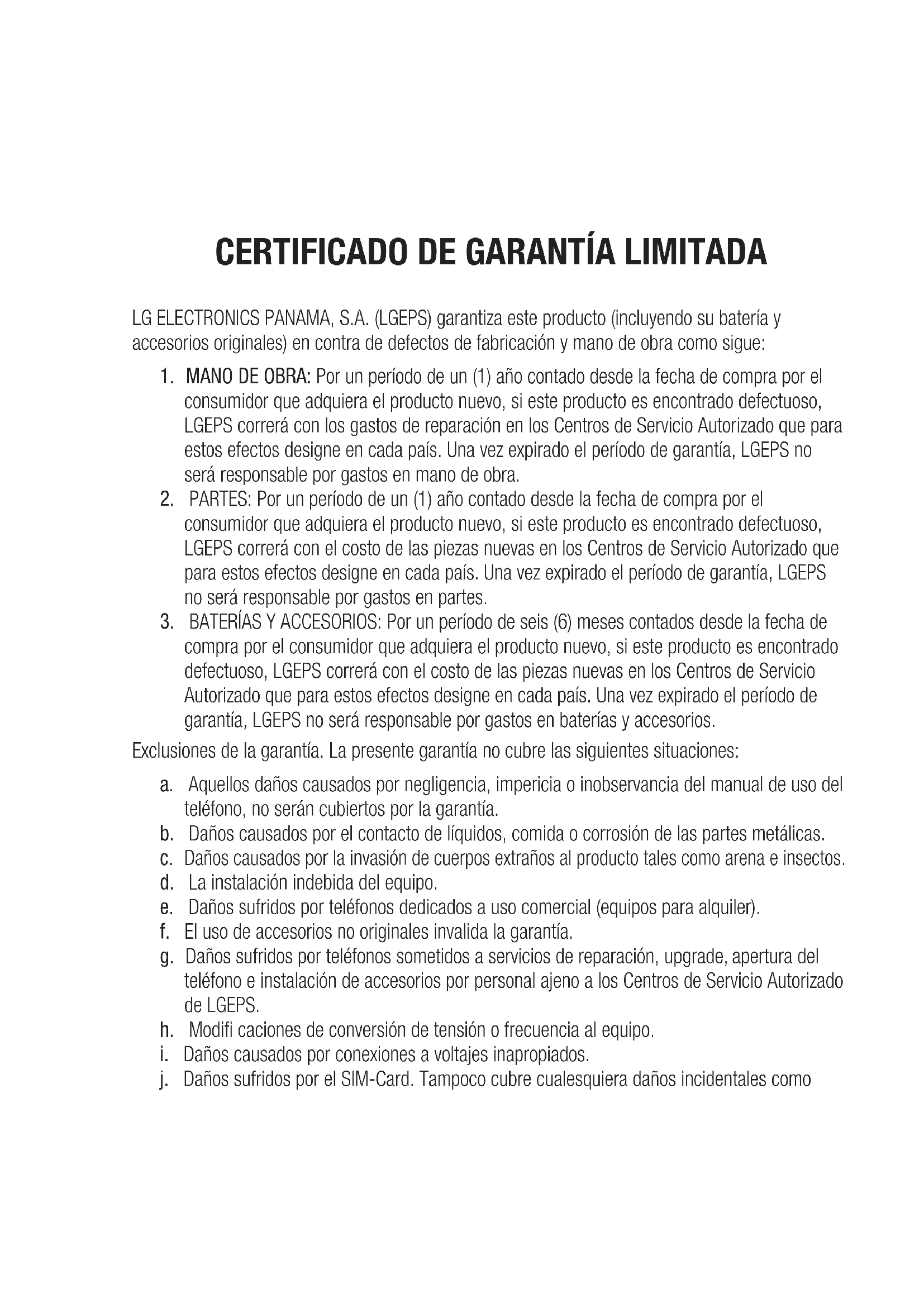 compra por el consumidor que adquiera el producto nuevo, si este producto es encontrado defectuoso, LGEPS correrá con el costo de las piezas nuevas en los Centros de Servicio Autorizado que para estos efectos designe en cada país. Una vez expirado el período de garantía, LGEPS no será responsable por gastos en baterías y accesorios. Exclusiones de la garantía. La presente garantía no cubre las siguientes situaciones: a. Aquellos daños causados por negligencia, impericia o inobservancia del manual de uso del teléfono, no serán cubiertos por la garantía. b. Daños causados por el contacto de líquidos, comida o corrosión de las partes metálicas.