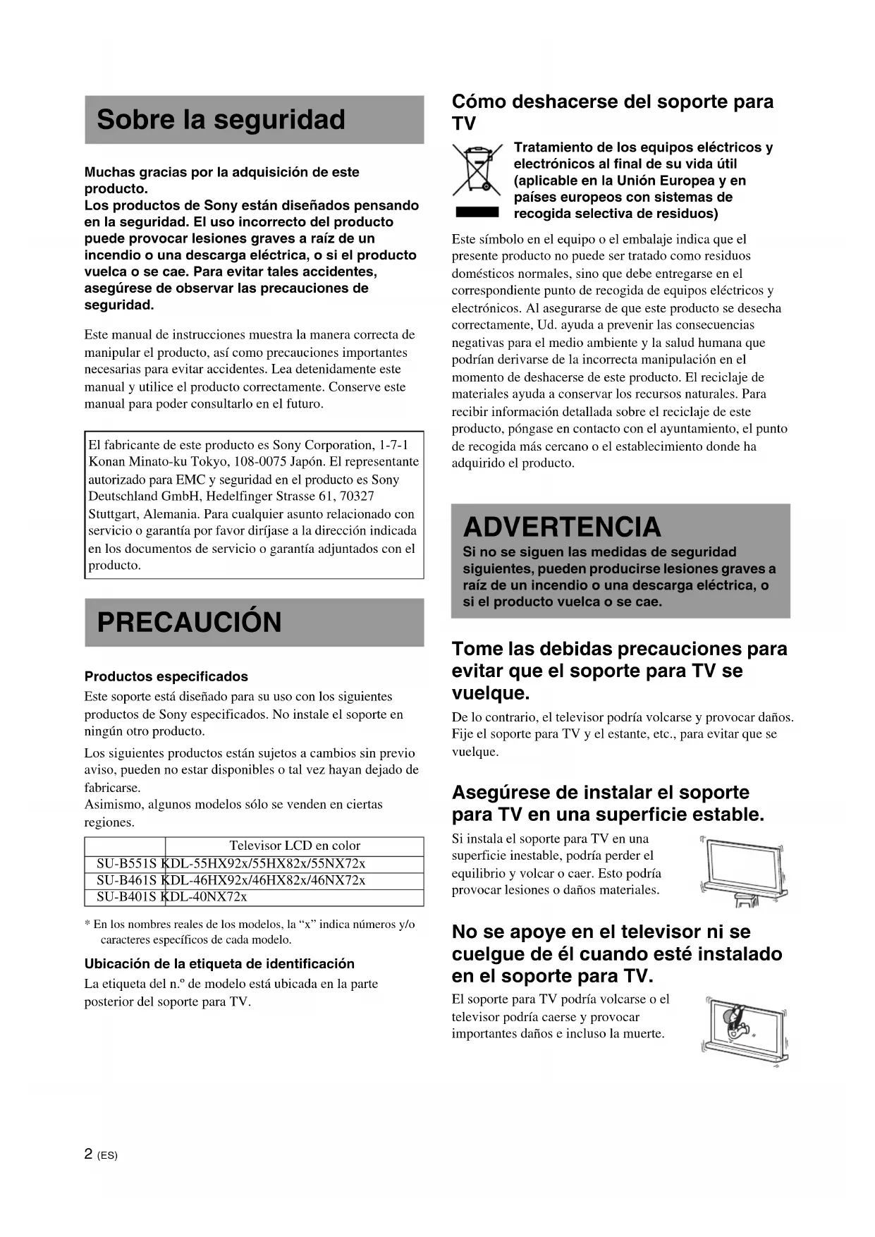 Tratamiento de los equipos eléctricos y electrónicos al final de su vida útil (aplicable en la Unión Europea y en países europeos con sistemas de recogida selectiva de residuos) Este símbolo en el equipo o el embalaje indica que el presente producto no puede ser tratado como residuos domésticos normales, sino que debe entregarse en el correspondiente punto de recogida de equipos eléctricos y electrónicos. Al asegurarse de que este producto se desecha correctamente, Ud. ayuda a prevenir las consecuencias negativas para el medio ambiente y la salud humana que podrían derivarse de la incorrecta manipulación en el momento de deshacerse de este producto. El reciclaje de materiales ayuda a conservar los recursos naturales. Para recibir información detallada sobre el reciclaje de este producto, póngase en contacto con el ayuntamiento, el punto de recogida más cercano o el establecimiento donde ha adquirido el producto. Tome las debidas precauciones para evitar que el soporte para TV se vuelque. De lo contrario, el televisor podría volcarse y provocar daños. Fije el soporte para TV y el estante, etc., para evitar que se vuelque. Asegúrese de instalar el soporte para TV en una superficie estable. Si instala el soporte para TV en una superficie inestable, podría perder el equilibrio y volcar o caer. Esto podría provocar lesiones o daños materiales. No se apoye en el televisor ni se cuelgue de él cuando esté instalado en el soporte para TV. El soporte para TV podría volcarse o el televisor podría caerse y provocar importantes daños e incluso la muerte. Sobre la seguridad El fabricante de este producto es Sony Corporation, 1-7-1 Konan Minato-ku Tokyo, 108-0075 Japón. El representante autorizado para EMC y seguridad en el producto es Sony Deutschland GmbH, Hedelfinger Strasse 61, 70327 Stuttgart, Alemania. Para cualquier asunto relacionado con servicio o garantía por favor diríjase a la dirección indicada en los documentos de servicio o garantía adjuntados con el producto. PRECAUCIÓN Televisor LCD en color SU-B551S KDL-55HX92x/55HX82x/55NX72x SU-B461S KDL-46HX92x/46HX82x/46NX72x SU-B401S KDL-40NX72x ADVERTENCIA Si no se siguen las medidas de seguridad siguientes, pueden producirse lesiones graves a raíz de un incendio o una descarga eléctrica, o si el producto vuelca o se cae.3 (ES) No obstruya el orificio de ventilación del televisor. Las rejillas de ventilación del televisor son necesarias para garantizar un buen funcionamiento del mismo y evitar sobrecalentamiento.