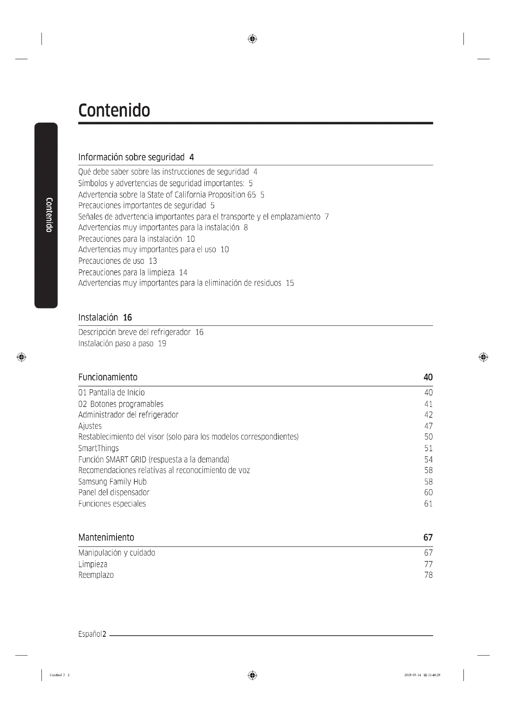 - Requires reader to be installed on your smartphone Contact SAMSUNG WORLD WIDE If you have any questions or comments relating to Samsung products, please contact the SAMSUNG Customer Care Center. Country Contact Center Web Site U.S.A - Consumer Electronics - Mobile Phones 1-800-SAMSUNG (726-7864) 1-844-SAM-PAYS (726-7297) www.samsung.com/us/support CANADA 1-800-SAMSUNG (726-7864) 1-844-SAM-PAYS (726-7297) www.samsung.com/ca/support (English) www.samsung.com/ca_fr/support (French) DA68-03894B-00 Untitled-4 100 2019-05-14 11:49:51Refrigerador Manual del usuario Electrodoméstico independiente Untitled-3 1 2019-05-14 11:46:29Español2 Contenido Contenido Información sobre seguridad 4 Qué debe saber sobre las instrucciones de seguridad 4 Símbolos y advertencias de seguridad importantes: 5 Advertencia sobre la State of California Proposition 65 5 Precauciones importantes de seguridad 5 Señales de advertencia importantes para el transporte y el emplazamiento 7 Advertencias muy importantes para la instalación 8 Precauciones para la instalación 10 Advertencias muy importantes para el uso 10 Precauciones de uso 13 Precauciones para la limpieza 14 Advertencias muy importantes para la eliminación de residuos 15 Instalación 16 Descripción breve del refrigerador 16 Instalación paso a paso 19 Funcionamiento 40 01 Pantalla de Inicio 40 02 Botones programables 41 Administrador del refrigerador 42 Ajustes 47 Restablecimiento del visor (solo para los modelos correspondientes) 50 SmartThings 51 Función SMART GRID (respuesta a la demanda) 54 Recomendaciones relativas al reconocimiento de voz 58 Samsung Family Hub 58 Panel del dispensador 60 Funciones especiales 61 Mantenimiento 67 Manipulación y cuidado 67 Limpieza 77 Reemplazo 78 Untitled-3 2 2019-05-14 11:46:29Español 3 Contenido Solución de problemas 81 General 81 ¿Se oyen ruidos anómalos procedentes del refrigerador? 86 SmartThings 89 Samsung Family Hub 90 Smart Grid (solo para los modelos correspondientes) 91 LCD 92