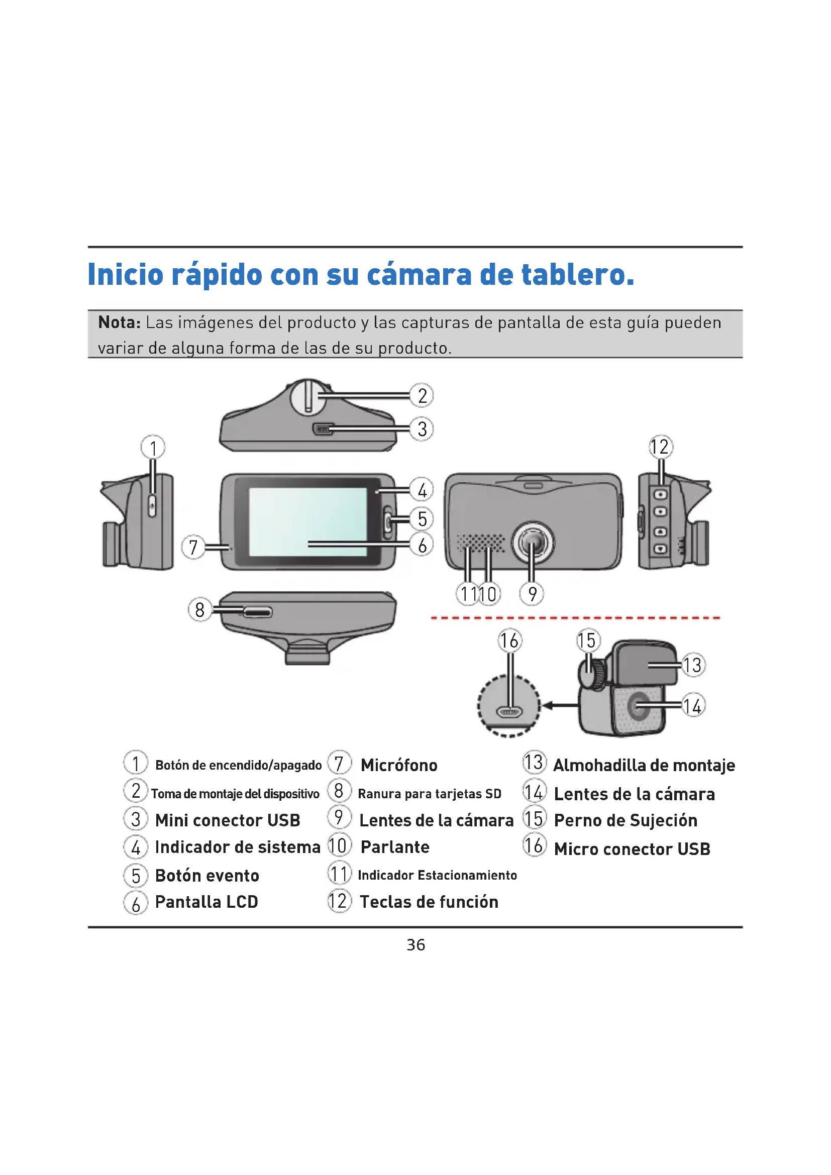 - Garantía Inicio rápido con su cámara de tablero. Nota: Las imágenes del producto y las capturas de pantalla de esta guía pueden variar de alguna forma de las de su producto. p. 6136