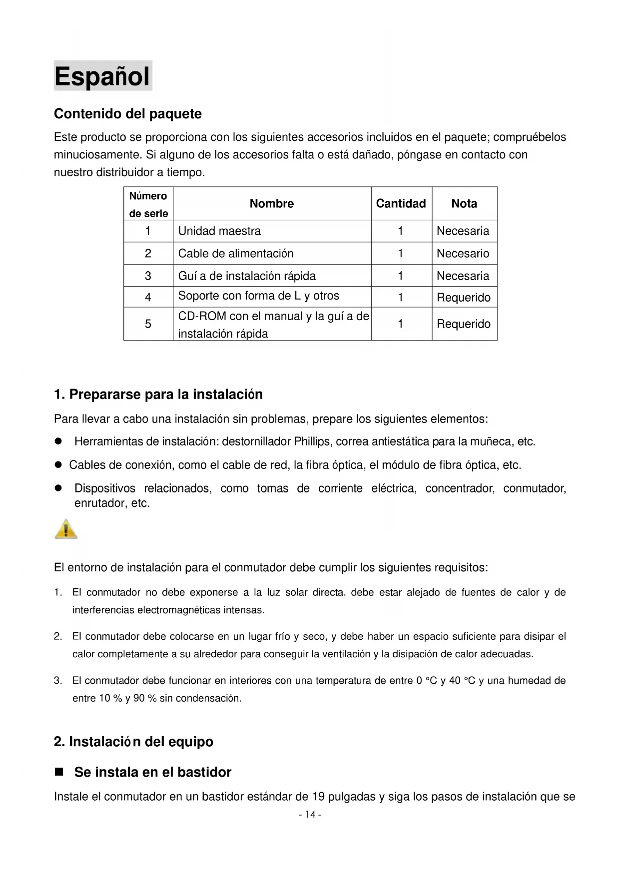 Para llevar a cabo una instalación sin problemas, prepare los siguientes elementos: Herramientas de instalación: destornillador Phillips, correa antiestática para la muñeca, etc. Cables de conexión, como el cable de red, la fibra óptica, el módulo de fibra óptica, etc. Dispositivos relacionados, como tomas de corriente eléctrica, concentrador, conmutador, enrutador, etc. El entorno de instalación para el conmutador debe cumplir los siguientes requisitos: