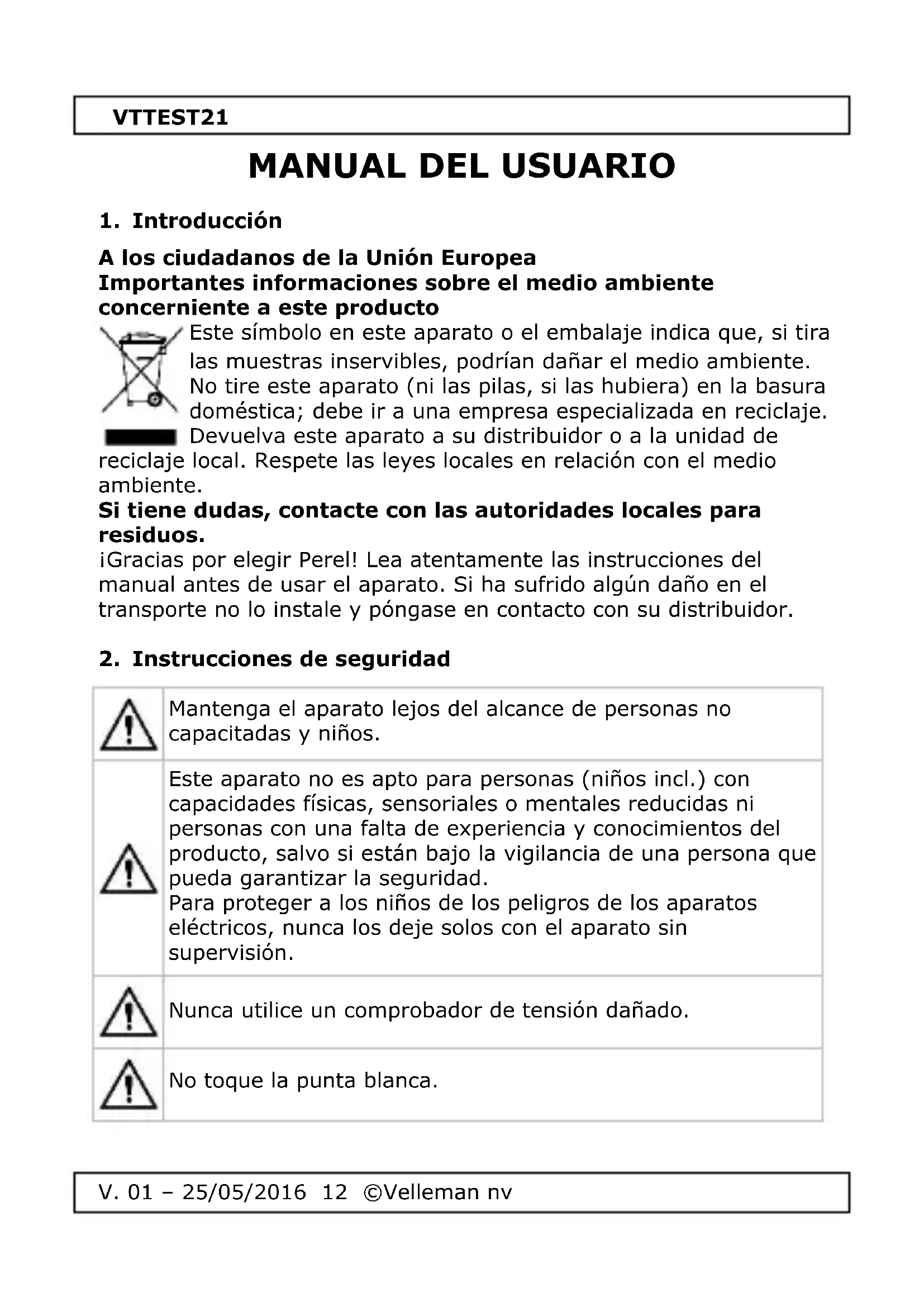 Encuentra gratis el manual del aparato VTTEST21 Perel en formato PDF.