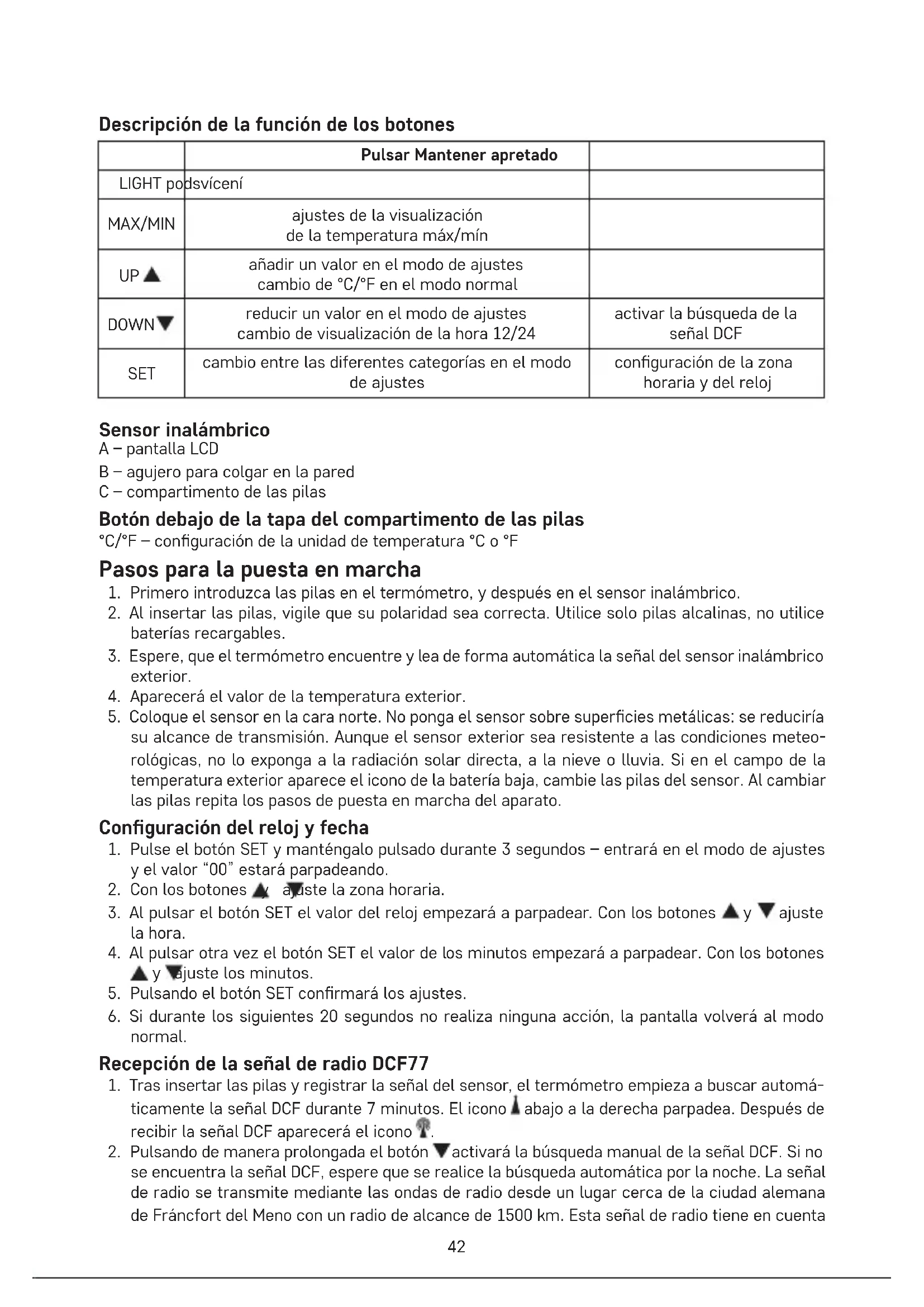 añadir un valor en el modo de ajustes cambio de °C/°F en el modo normal DOWN reducir un valor en el modo de ajustes cambio de visualización de la hora 12/24 activar la búsqueda de la señal DCF SET cambio entre las diferentes categorías en el modo de ajustes conguración de la zona horaria y del reloj Sensor inalámbrico A – pantalla LCD B – agujero para colgar en la pared C – compartimento de las pilas Botón debajo de la tapa del compartimento de las pilas °C/°F – conguración de la unidad de temperatura °C o °F Pasos para la puesta en marcha