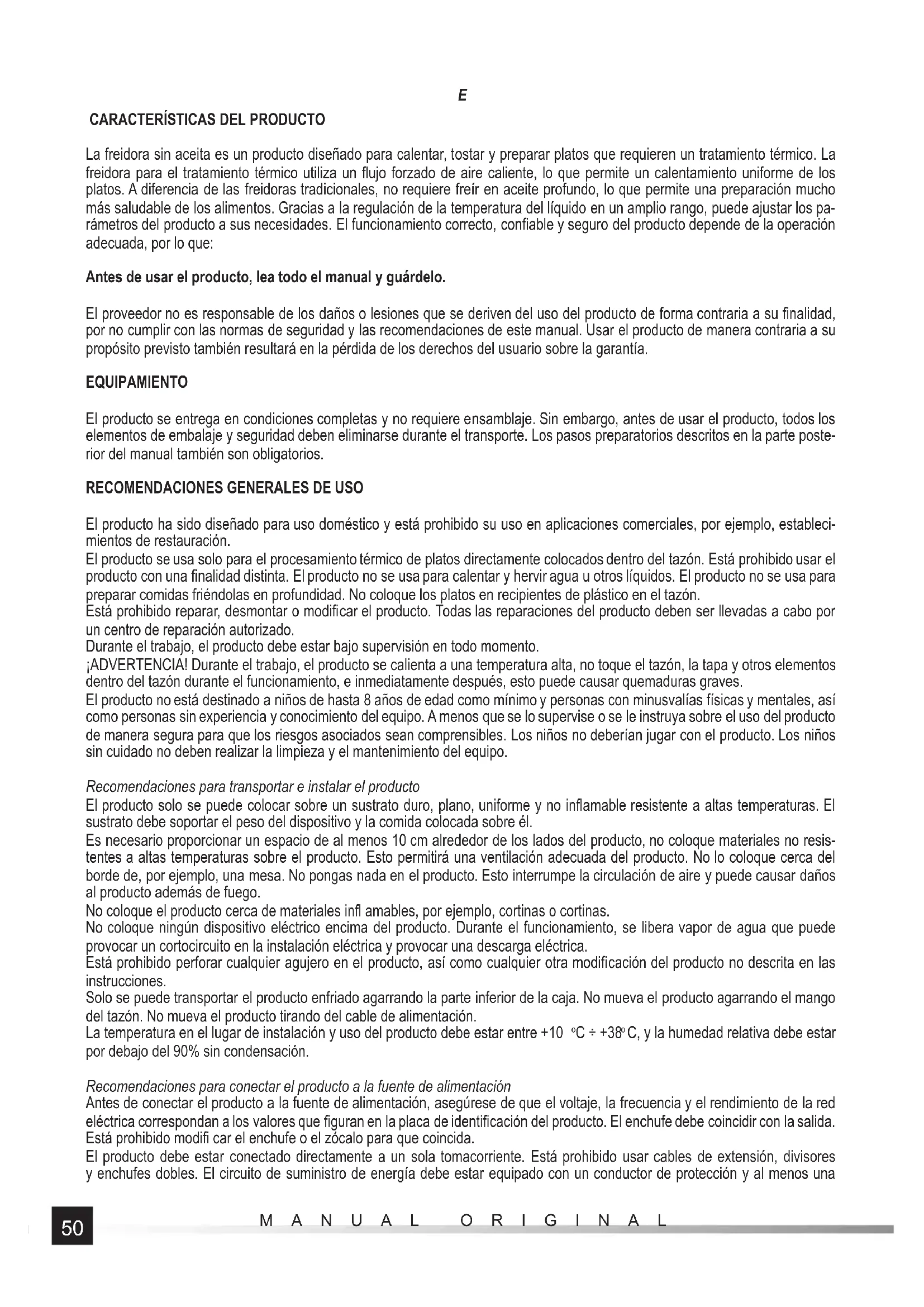 El producto ha sido equipado con un panel de control táctil con una pantalla de luz. Después de conectar el producto a la fuente de alimentación, sonará un pitido, la pantalla mostrará „---”. El botón de encendido también se iluminará. El producto está en modo de espera. Tocar el interruptor iniciará el modo de confi guración del producto. La pantalla mostrará alternativamente la confi guración de temperatura predeterminada y el tiempo en minutos. Puede cambiar la confi guración de la hora usando los botones marcados con el símbolo del reloj. Puede cambiar la confi guración de temperatura con los botones marcados con el símbolo de termómetro. El botón marcado „+” aumenta el valor de la confi guración, el botón marcado „-” reduce la altura de la confi guración. Cada toque del botón se señalará con una señal audible y el cambio de la confi guración visible en la pantalla. El botón marcado con „M” le permite seleccionar uno de los modos de operación predefi nidos. Cada modo es una combinación de ajustes de tiempo y temperatura, que se muestran alternativamente en la pantalla. La selección del modo se señaliza mediante una señal acústica y la luz de fondo del símbolo del modo seleccionado en la pan- talla. En cada modo, puede cambiar la confi guración de tiempo y temperatura. Sin embargo, los valores no se guardarán como nuevas confi guraciones del modo dado. Los modos de funcionamiento se pueden cambiar en el siguiente ciclo: patatas fritas - costillas - gambas - masa - aves de corral - carne - pescado. ¡Precaución! Durante la programación de las confi guraciones, el producto regresa automáticamente al modo de espera luego de aproximadamente un minuto desde el último toque del botón. Después de ajustar la hora y la temperatura, toque el interruptor en menos de un minuto. Esto iniciará el trabajo, que será señala- do por el parpadeo del símbolo del ventilador. Cuando el símbolo del ventilador está resaltado en rojo, el calentador del producto está funcionando. Cuando el símbolo del ventilador está resaltado en azul, el ventilador está funcionando. El producto se puede apagar en cualquier momento tocando el botón del interruptor. Después de apagar, el ventilador puede continuar funcionando por un tiempo, acelerando el enfriamiento del calentador. No desconecte el producto de la fuente de ali- mentación durante este tiempo. Una vez que el calentador haya terminado de enfriarse, el producto pasará automáticamente al modo de espera. Desconecte el cable de alimentación del tomacorriente. Instalación, puesta en marcha y servicio del producto El producto debe desempaquetarse, eliminando por completo todos los elementos de embalaje y seguridad durante el transporte. Se recomienda guardar el empaque, puede ser útil en el posterior transporte y almacenamiento del producto. Lave el producto de acuerdo con las instrucciones en „Mantenimiento del producto”. Confi gure el producto de acuerdo con las instrucciones. Inserte el tazón con el pestillo y vacíe en la carcasa del producto. Al insertar el tazón, la tapa del pestillo de la tapa del tazón debe moverse por encima del botón. Conecte el producto a la fuente de alimentación. Establece la temperatura máxima. Establezca el tiempo en 3 minutos para precalentar el tazón y volver a llenarlo. La luz que indica el comienzo del trabajo se ilumina. Después de transcurrido el tiempo establecido, sonará una señal audible y la luz se apagará. Tenga cuidado, agarre la manija del tazón y sáquelo de la carcasa del producto. El tazón y la inserción se calentarán, por lo que no los toque. Coloque la comida preparada para el procesamiento térmico dentro de la inserción. Si el producto tiene accesorios como una cacerola, una pizzera o un defl ector, colóquelos en el interior del inserto. Para el buen funcionamiento de la freidora siempre es necesario usarla con la cubeta y el inserto. ¡Precaución! El nivel de productos alimenticios dentro de la inserción no debe exceder la marca de la capacidad máxima de la inserción. Inserte el tazón con el inserto y los alimentos en la carcasa del producto. Establezca el tiempo de acuerdo con la receta para la preparación de alimentos.53 MANUAL ORIGINAL