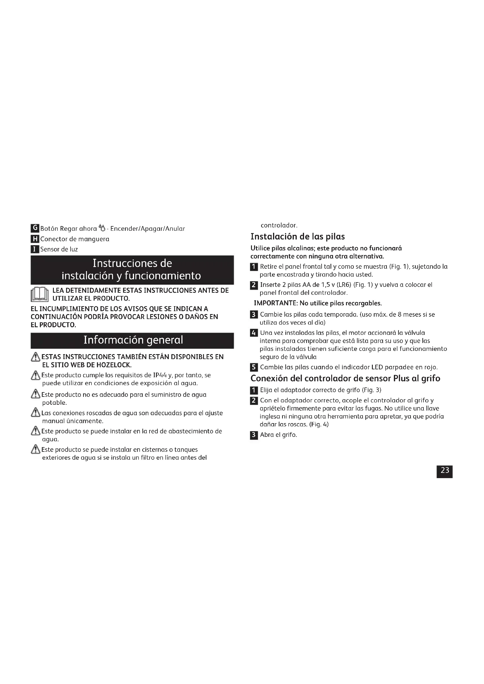 UTILIZAR EL PRODUCTO. EL INCUMPLIMIENTO DE LOS AVISOS QUE SE INDICAN A CONTINUACIÓN PODRÍA PROVOCAR LESIONES O DAÑOS EN EL PRODUCTO. Información general ESTAS INSTRUCCIONES TAMBIÉN ESTÁN DISPONIBLES EN EL SITIO WEB DE HOZELOCK. Este producto cumple los requisitos de IP44 y, por tanto, se puede utilizar en condiciones de exposición al agua. Este producto no es adecuado para el suministro de agua potable. Las conexiones roscadas de agua son adecuadas para el ajuste manual únicamente. Este producto se puede instalar en la red de abastecimiento de agua. Este producto se puede instalar en cisternas o tanques exteriores de agua si se instala un filtro en línea antes del controlador. Instalación de las pilas Utilice pilas alcalinas; este producto no funcionará correctamente con ninguna otra alternativa.