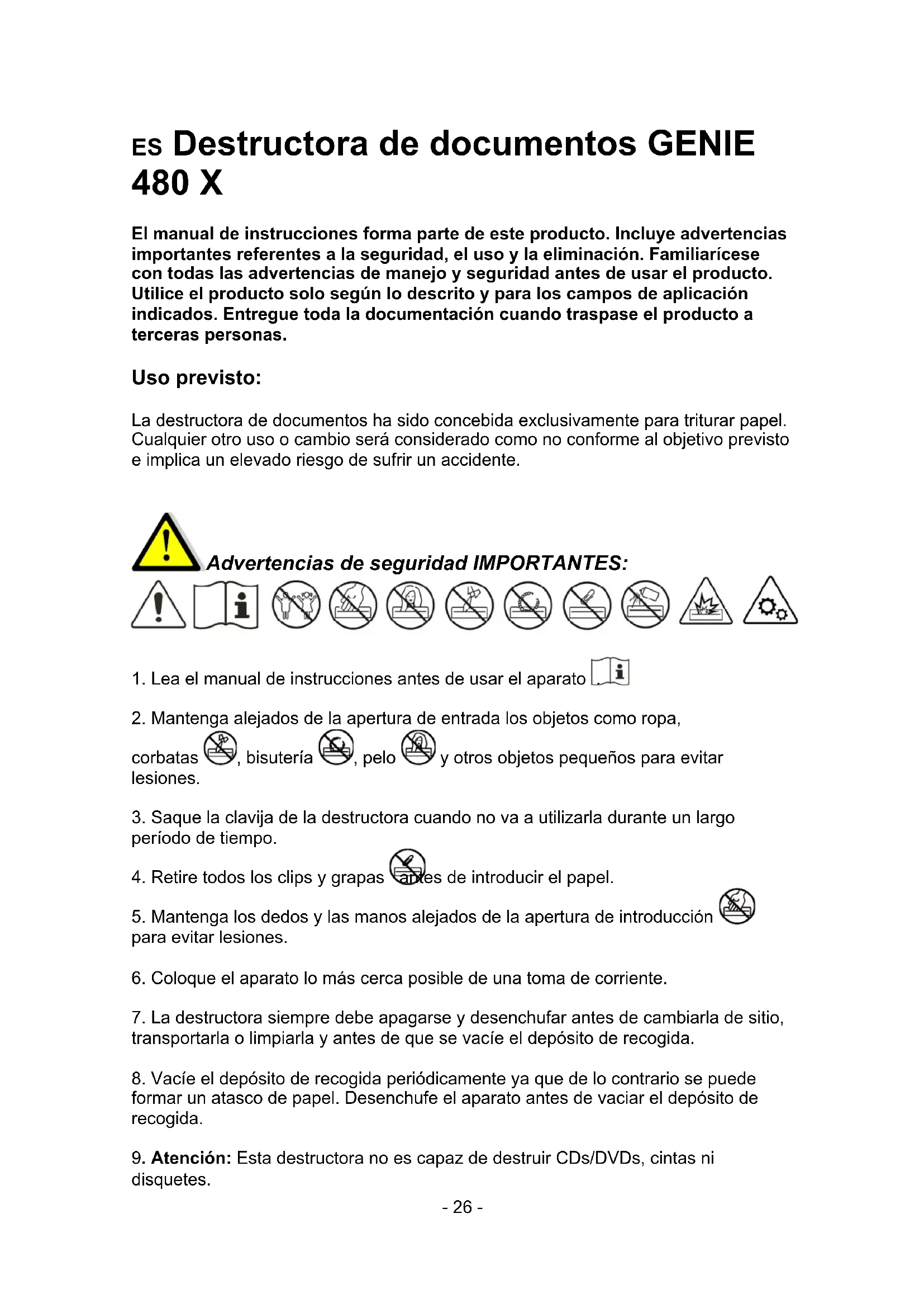 9. Atención: Esta destructora no es capaz de destruir CDs/DVDs, cintas ni