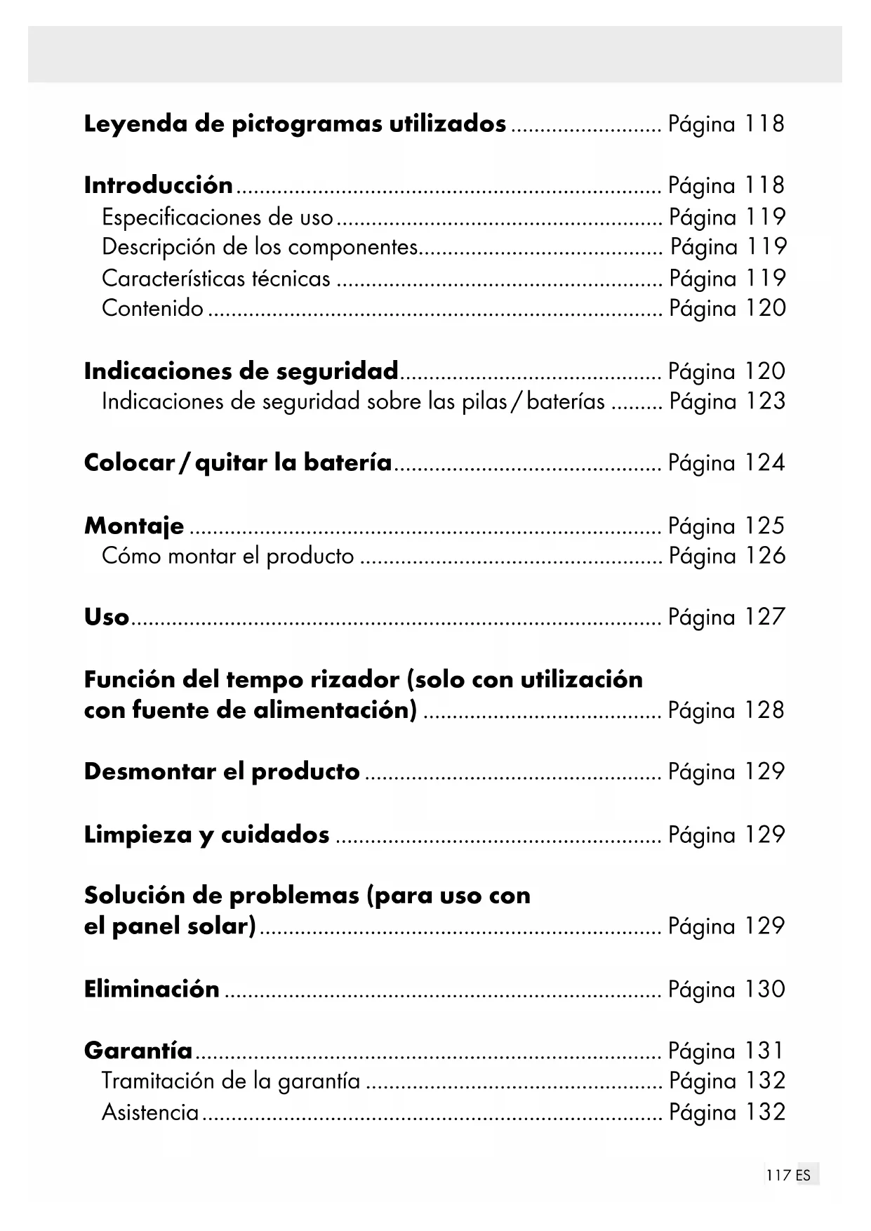 la toma de corriente.129 ES Desmontar el producto Desmonte el producto en orden inverso (ver apartado «Montar el producto»). Asegúrese de que todas las piezas han sido retiradas. Limpieza y cuidados
